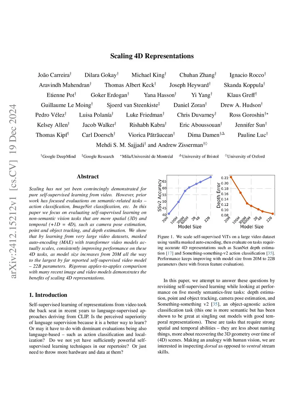 Scaling has not yet been convincingly demonstrated for pure self-supervised learning from video. However, prior work has focused evaluations on semantic-related tasks action classification, ImageNet classification, etc. In this paper we focus on evaluating self-supervised learning on non-semantic vision tasks that are more spatial (3D) and temporal (+1D = 4D), such as camera pose estimation, point and object tracking, and depth estimation. We show that by learning from very large video datasets, masked auto-encoding (MAE) with transformer video models actually scales, consistently improving performance on these 4D tasks, as model size increases from 20M all the way to the largest by far reported self-supervised video model 22B parameters. Rigorous apples-to-apples comparison with many recent image and video models demonstrates the benefits of scaling 4D representations. Pretrained models are available atthis https URL.