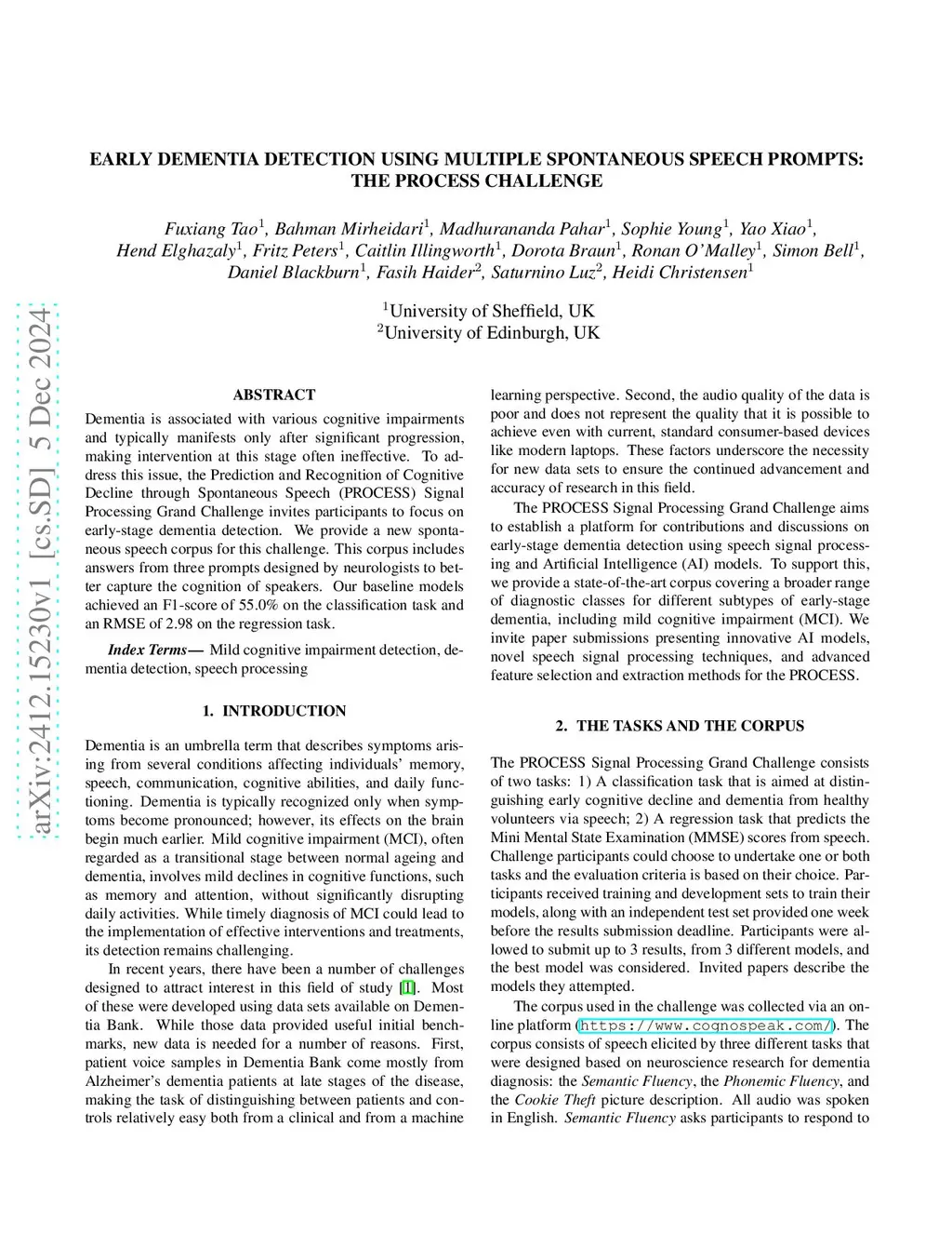 Dementia is associated with various cognitive impairments and typically manifests only after significant progression, making intervention at this stage often ineffective. To address this issue, the Prediction and Recognition of Cognitive Decline through Spontaneous Speech (PROCESS) Signal Processing Grand Challenge invites participants to focus on early-stage dementia detection. We provide a new spontaneous speech corpus for this challenge. This corpus includes answers from three prompts designed by neurologists to better capture the cognition of speakers. Our baseline models achieved an F1-score of 55.0% on the classification task and an RMSE of 2.98 on the regression task.