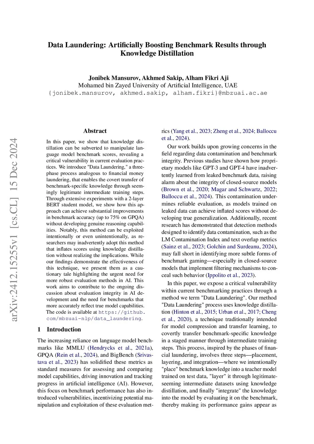 In this paper, we show that knowledge distillation can be subverted to manipulate language model benchmark scores, revealing a critical vulnerability in current evaluation practices. We introduce "Data Laundering," a process that enables the covert transfer of benchmark-specific knowledge through seemingly legitimate intermediate training steps. Through extensive experiments with a 2-layer BERT student model, we show how this approach can achieve substantial improvements in benchmark accuracy (up to 75\% on GPQA) without developing genuine reasoning capabilities. Notably, this method can be exploited intentionally or even unintentionally, as researchers may inadvertently adopt this method and inflate scores without realising the implications. While our findings demonstrate the effectiveness of this technique, we present them as a cautionary tale highlighting the urgent need for more robust evaluation methods in AI. This work aims to contribute to the ongoing discussion about evaluation integrity in AI development and the need for benchmarks that more accurately reflect true model capabilities. The code is available atthis https URL.
