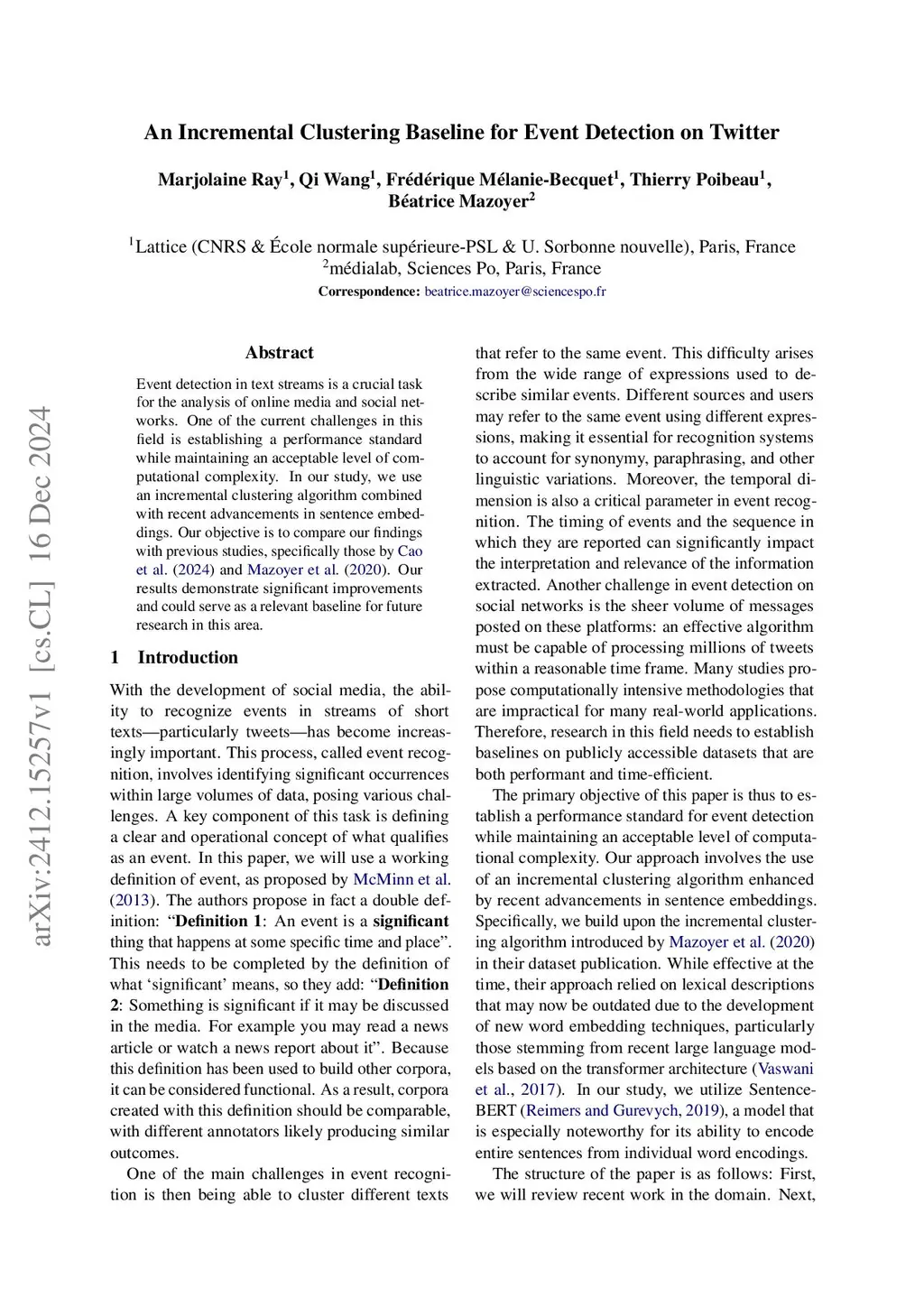 Event detection in text streams is a crucial task for the analysis of online media and social networks. One of the current challenges in this field is establishing a performance standard while maintaining an acceptable level of computational complexity. In our study, we use an incremental clustering algorithm combined with recent advancements in sentence embeddings. Our objective is to compare our findings with previous studies, specifically those by Cao et al. (2024) and Mazoyer et al. (2020). Our results demonstrate significant improvements and could serve as a relevant baseline for future research in this area.