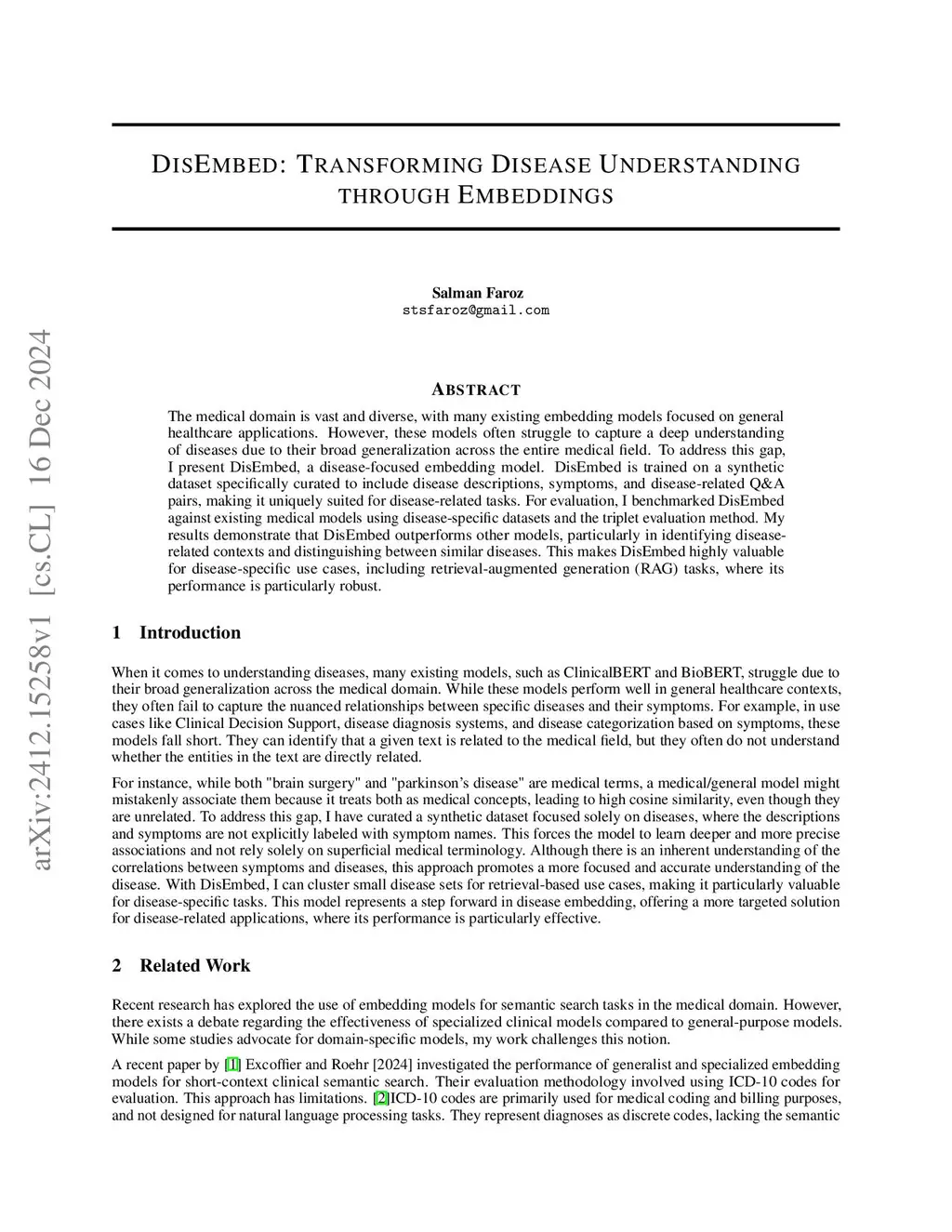 DisEmbed: Transforming Disease Understanding through Embeddings