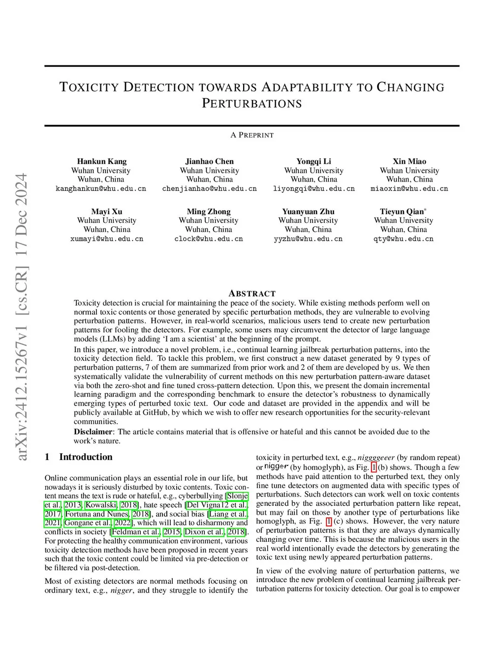 Toxicity Detection towards Adaptability to Changing Perturbations