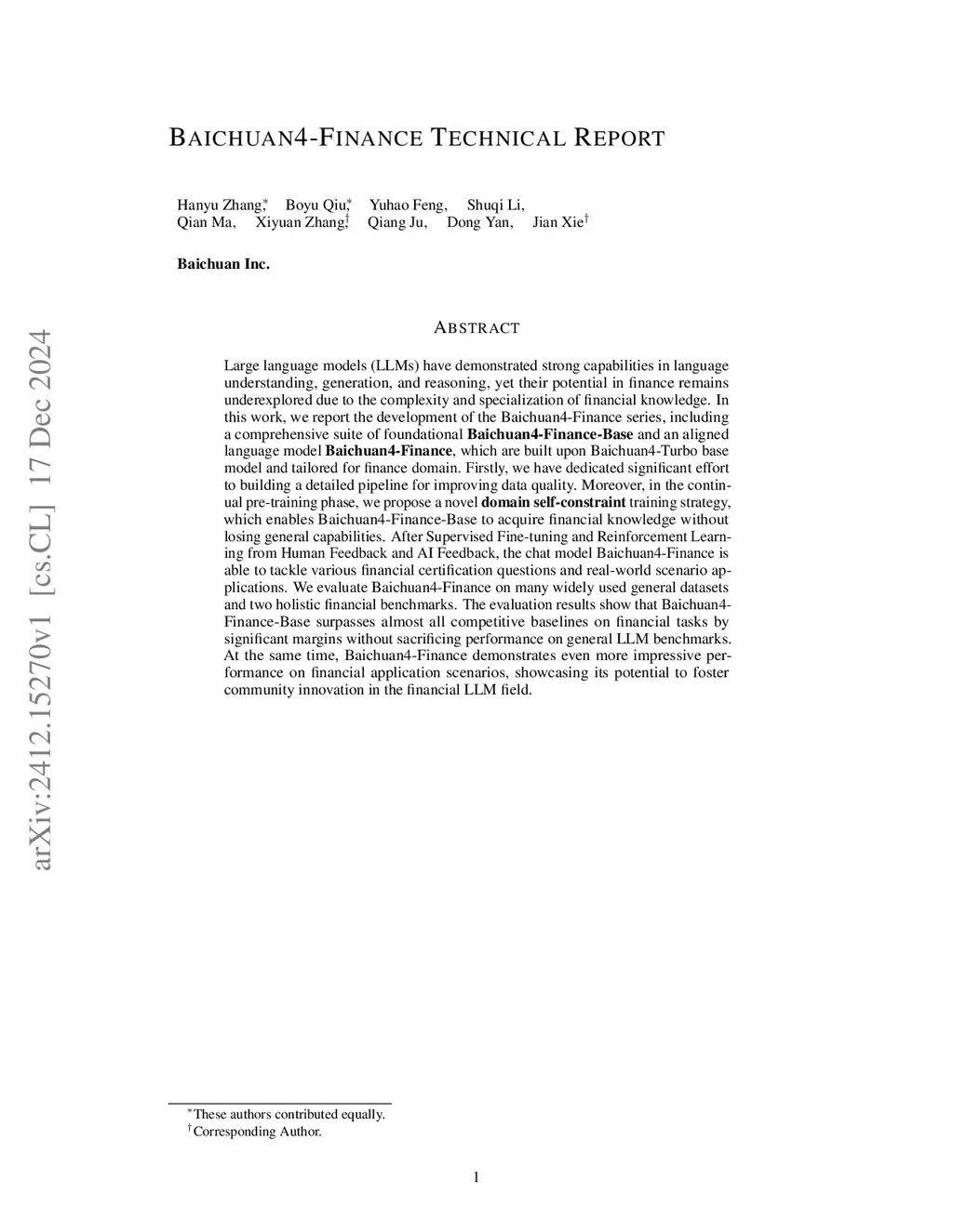 Large language models (LLMs) have demonstrated strong capabilities in language understanding, generation, and reasoning, yet their potential in finance remains underexplored due to the complexity and specialization of financial knowledge. In this work, we report the development of the Baichuan4-Finance series, including a comprehensive suite of foundational Baichuan4-Finance-Base and an aligned language model Baichuan4-Finance, which are built upon Baichuan4-Turbo base model and tailored for finance domain. Firstly, we have dedicated significant effort to building a detailed pipeline for improving data quality. Moreover, in the continual pre-training phase, we propose a novel domain self-constraint training strategy, which enables Baichuan4-Finance-Base to acquire financial knowledge without losing general capabilities. After Supervised Fine-tuning and Reinforcement Learning from Human Feedback and AI Feedback, the chat model Baichuan4-Finance is able to tackle various financial certification questions and real-world scenario applications. We evaluate Baichuan4-Finance on many widely used general datasets and two holistic financial benchmarks. The evaluation results show that Baichuan4-Finance-Base surpasses almost all competitive baselines on financial tasks by significant margins without sacrificing performance on general LLM benchmarks. At the same time, Baichuan4-Finance demonstrates even more impressive performance on financial application scenarios, showcasing its potential to foster community innovation in the financial LLM field.