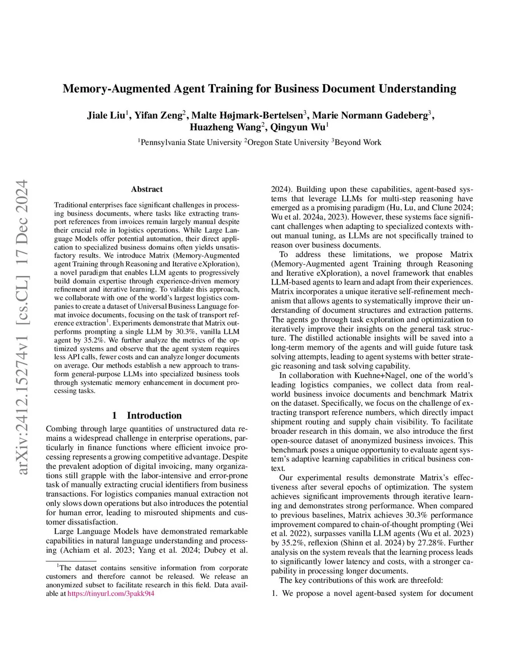 Traditional enterprises face significant challenges in processing business documents, where tasks like extracting transport references from invoices remain largely manual despite their crucial role in logistics operations. While Large Language Models offer potential automation, their direct application to specialized business domains often yields unsatisfactory results. We introduce Matrix (Memory-Augmented agent Training through Reasoning and Iterative eXploration), a novel paradigm that enables LLM agents to progressively build domain expertise through experience-driven memory refinement and iterative learning. To validate this approach, we collaborate with one of the world's largest logistics companies to create a dataset of Universal Business Language format invoice documents, focusing on the task of transport reference extraction. Experiments demonstrate that Matrix outperforms prompting a single LLM by 30.3%, vanilla LLM agent by 35.2%. We further analyze the metrics of the optimized systems and observe that the agent system requires less API calls, fewer costs and can analyze longer documents on average. Our methods establish a new approach to transform general-purpose LLMs into specialized business tools through systematic memory enhancement in document processing tasks.