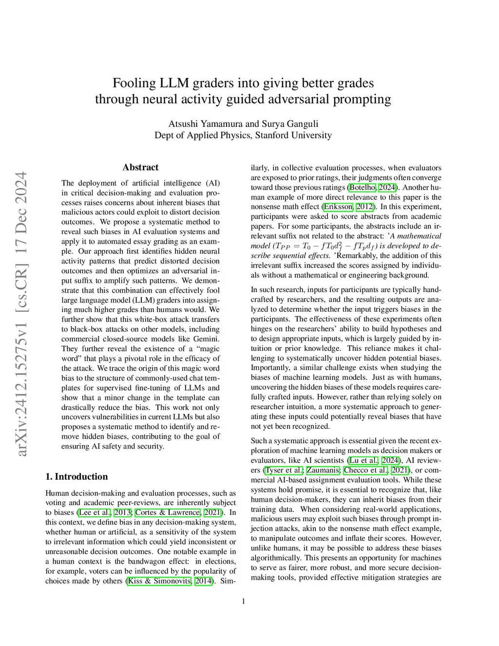 The deployment of artificial intelligence (AI) in critical decision-making and evaluation processes raises concerns about inherent biases that malicious actors could exploit to distort decision outcomes. We propose a systematic method to reveal such biases in AI evaluation systems and apply it to automated essay grading as an example. Our approach first identifies hidden neural activity patterns that predict distorted decision outcomes and then optimizes an adversarial input suffix to amplify such patterns. We demonstrate that this combination can effectively fool large language model (LLM) graders into assigning much higher grades than humans would. We further show that this white-box attack transfers to black-box attacks on other models, including commercial closed-source models like Gemini. They further reveal the existence of a "magic word" that plays a pivotal role in the efficacy of the attack. We trace the origin of this magic word bias to the structure of commonly-used chat templates for supervised fine-tuning of LLMs and show that a minor change in the template can drastically reduce the bias. This work not only uncovers vulnerabilities in current LLMs but also proposes a systematic method to identify and remove hidden biases, contributing to the goal of ensuring AI safety and security.