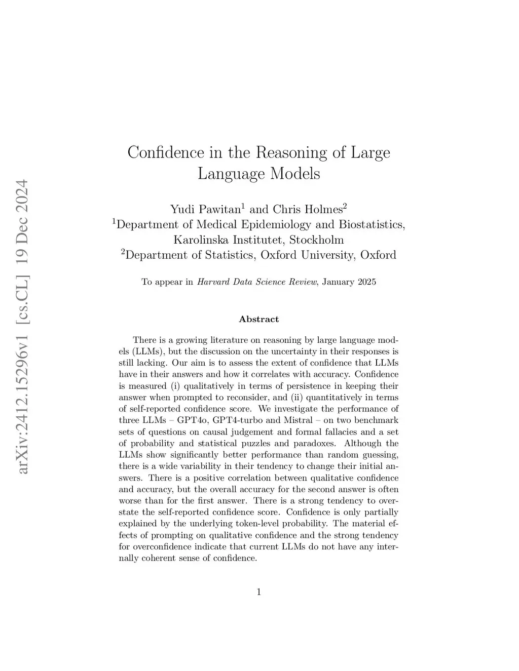 There is a growing literature on reasoning by large language models (LLMs), but the discussion on the uncertainty in their responses is still lacking. Our aim is to assess the extent of confidence that LLMs have in their answers and how it correlates with accuracy. Confidence is measured (i) qualitatively in terms of persistence in keeping their answer when prompted to reconsider, and (ii) quantitatively in terms of self-reported confidence score. We investigate the performance of three LLMs -- GPT4o, GPT4-turbo and Mistral -- on two benchmark sets of questions on causal judgement and formal fallacies and a set of probability and statistical puzzles and paradoxes. Although the LLMs show significantly better performance than random guessing, there is a wide variability in their tendency to change their initial answers. There is a positive correlation between qualitative confidence and accuracy, but the overall accuracy for the second answer is often worse than for the first answer. There is a strong tendency to overstate the self-reported confidence score. Confidence is only partially explained by the underlying token-level probability. The material effects of prompting on qualitative confidence and the strong tendency for overconfidence indicate that current LLMs do not have any internally coherent sense of confidence.