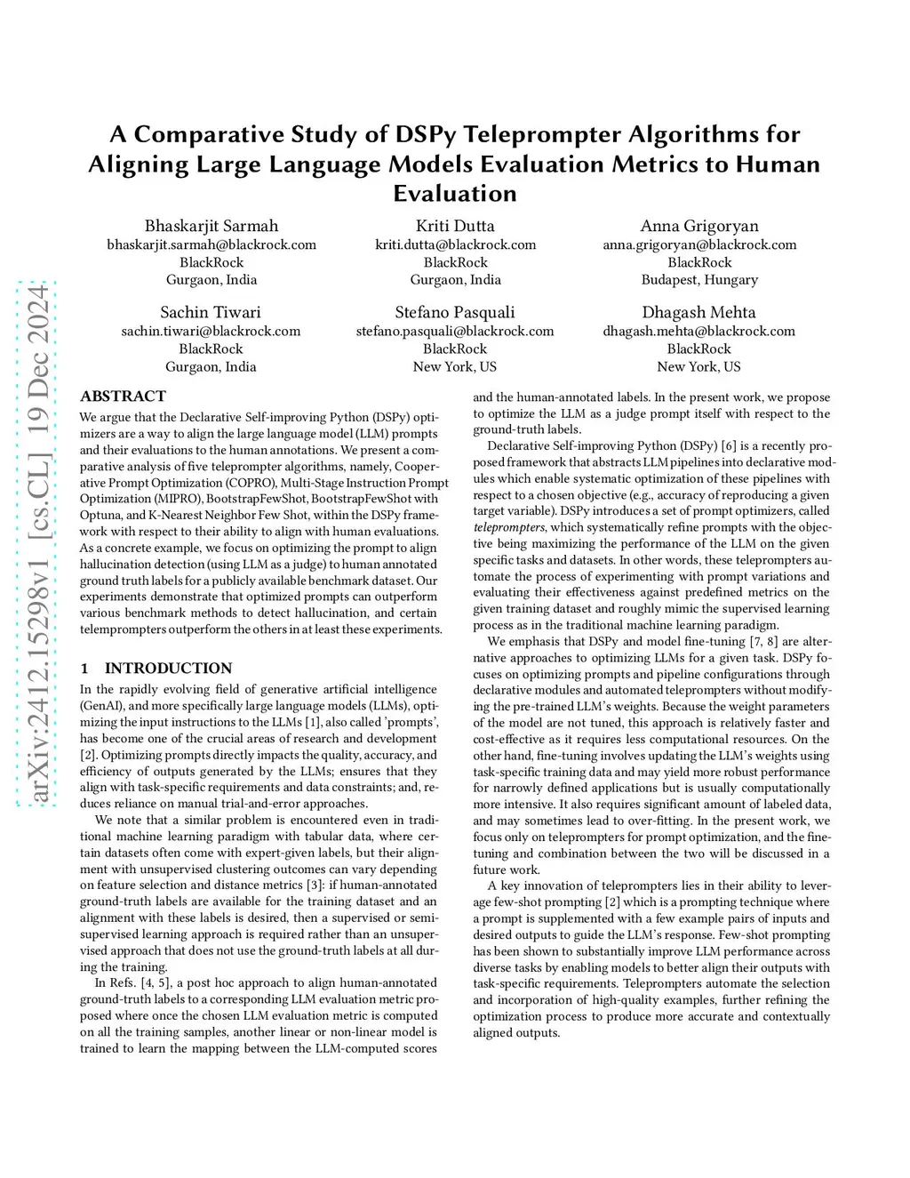 We argue that the Declarative Self-improving Python (DSPy) optimizers are a way to align the large language model (LLM) prompts and their evaluations to the human annotations. We present a comparative analysis of five teleprompter algorithms, namely, Cooperative Prompt Optimization (COPRO), Multi-Stage Instruction Prompt Optimization (MIPRO), BootstrapFewShot, BootstrapFewShot with Optuna, and K-Nearest Neighbor Few Shot, within the DSPy framework with respect to their ability to align with human evaluations. As a concrete example, we focus on optimizing the prompt to align hallucination detection (using LLM as a judge) to human annotated ground truth labels for a publicly available benchmark dataset. Our experiments demonstrate that optimized prompts can outperform various benchmark methods to detect hallucination, and certain telemprompters outperform the others in at least these experiments.