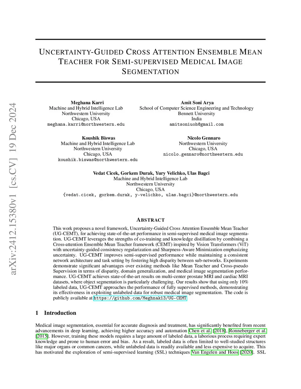 Uncertainty-Guided Cross Attention Ensemble Mean Teacher for