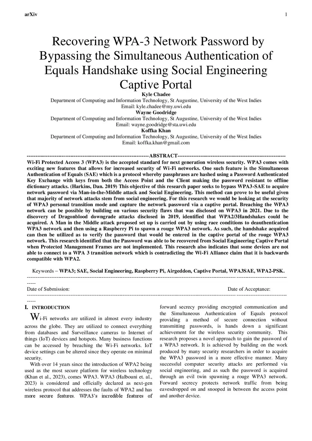 Wi-Fi Protected Access 3 (WPA3) is the accepted standard for next generation wireless security. WPA3 comes with exciting new features that allows for increased security of Wi-Fi networks. One such feature is the Simultaneous Authentication of Equals (SAE) which is a protocol whereby passphrases are hashed using a Password Authenticated Key Exchange with keys from both the Access Point and the Client making the password resistant to offline dictionary attacks. (Harkins, Dan. 2019) This objective of this research paper seeks to bypass WPA3-SAE to acquire network password via Man-in-the-Middle attack and Social Engineering. This method can prove to be useful given that majority of network attacks stem from social engineering. For this research we would be looking at the security of WPA3 personal transition mode and capture the network password via a captive portal. Breaching the WPA3 network can be possible by building on various security flaws that was disclosed on WPA3 in 2021. Due to the discovery of Dragonblood downgrade attacks disclosed in 2019, identified that WPA2/3Handshakes could be acquired. A Man in the Middle attack proposed set up is carried out by using race conditions to deauthentication WPA3 network and then using a Raspberry Pi to spawn a rouge WPA3 network. As such, the handshake acquired can then be utilized as to verify the password that would be entered in the captive portal of the rouge WPA3 network. This research identified that the Password was able to be recovered from Social Engineering Captive Portal when Protected Management Frames are not implemented. This research also indicates that some devices are not able to connect to a WPA 3 transition network which is contradicting the Wi-Fi Alliance claim that it is backwards compatible with WPA2.