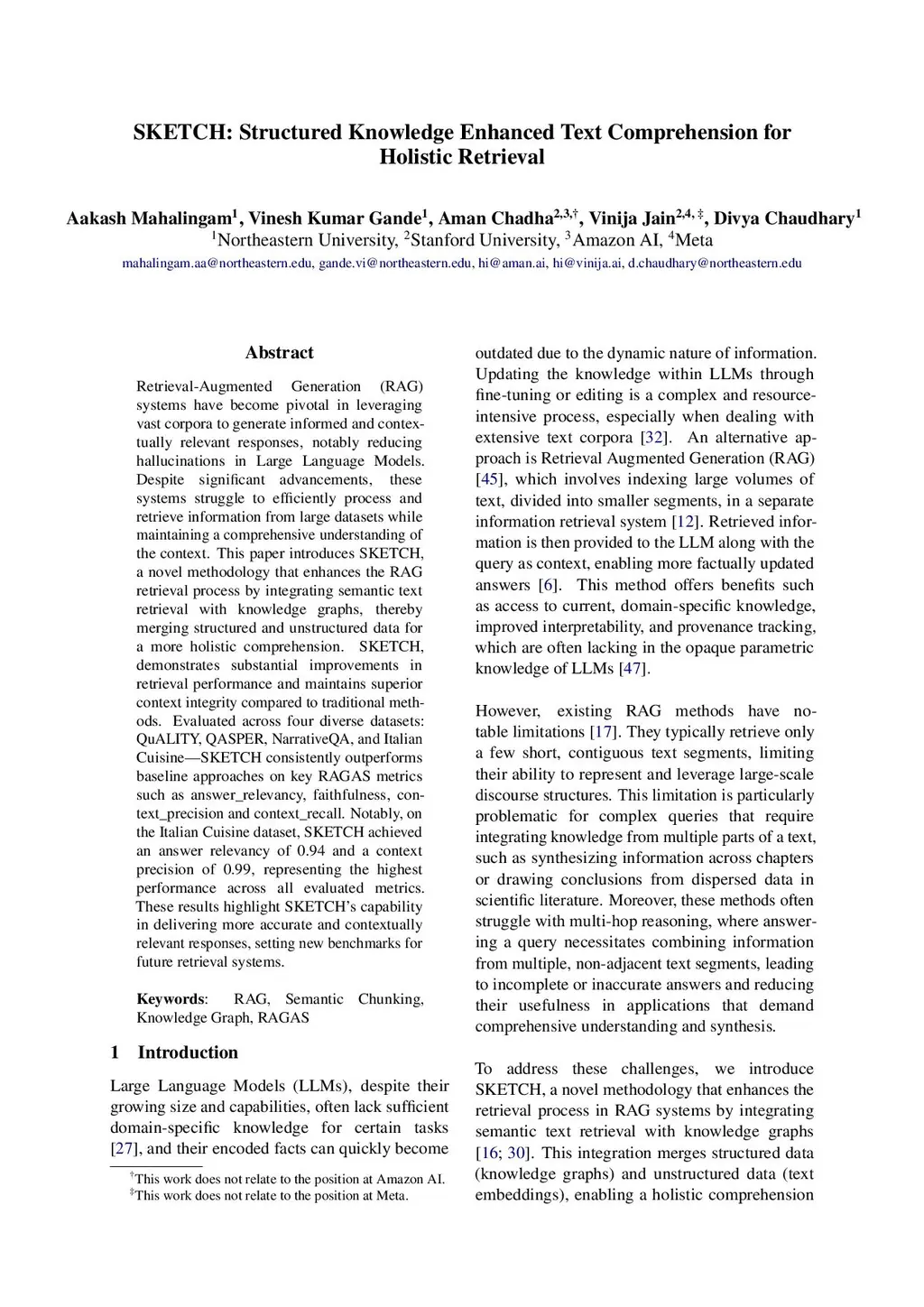 Retrieval-Augmented Generation (RAG) systems have become pivotal in leveraging vast corpora to generate informed and contextually relevant responses, notably reducing hallucinations in Large Language Models. Despite significant advancements, these systems struggle to efficiently process and retrieve information from large datasets while maintaining a comprehensive understanding of the context. This paper introduces SKETCH, a novel methodology that enhances the RAG retrieval process by integrating semantic text retrieval with knowledge graphs, thereby merging structured and unstructured data for a more holistic comprehension. SKETCH, demonstrates substantial improvements in retrieval performance and maintains superior context integrity compared to traditional methods. Evaluated across four diverse datasets: QuALITY, QASPER, NarrativeQA, and Italian Cuisine-SKETCH consistently outperforms baseline approaches on key RAGAS metrics such as answer_relevancy, faithfulness, context_precision and context_recall. Notably, on the Italian Cuisine dataset, SKETCH achieved an answer relevancy of 0.94 and a context precision of 0.99, representing the highest performance across all evaluated metrics. These results highlight SKETCH's capability in delivering more accurate and contextually relevant responses, setting new benchmarks for future retrieval systems.