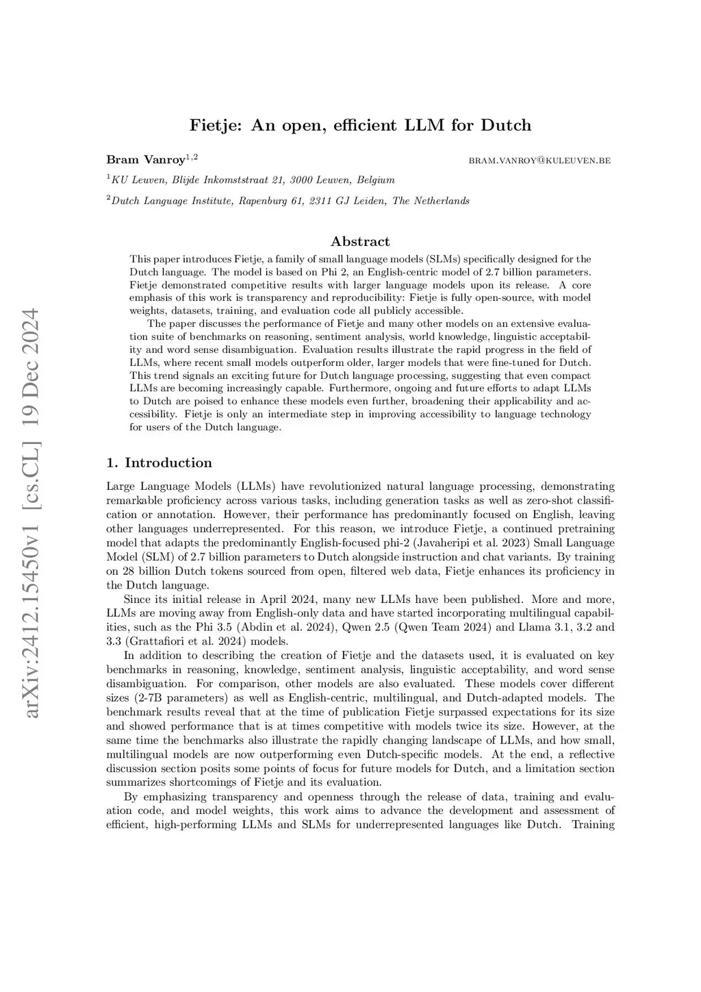 This paper introduces Fietje, a family of small language models (SLMs) specifically designed for the Dutch language. The model is based on Phi 2, an English-centric model of 2.7 billion parameters. Fietje demonstrated competitive results with larger language models upon its release. A core emphasis of this work is transparency and reproducibility: Fietje is fully open-source, with model weights, datasets, training, and evaluation code all publicly accessible. The paper discusses the performance of Fietje and many other models on an extensive evaluation suite of benchmarks on reasoning, sentiment analysis, world knowledge, linguistic acceptability and word sense disambiguation. Evaluation results illustrate the rapid progress in the field of LLMs, where recent small models outperform older, larger models that were fine-tuned for Dutch. This trend signals an exciting future for Dutch language processing, suggesting that even compact LLMs are becoming increasingly capable. Furthermore, ongoing and future efforts to adapt LLMs to Dutch are poised to enhance these models even further, broadening their applicability and accessibility. Fietje is only an intermediate step in improving accessibility to language technology for users of the Dutch language.