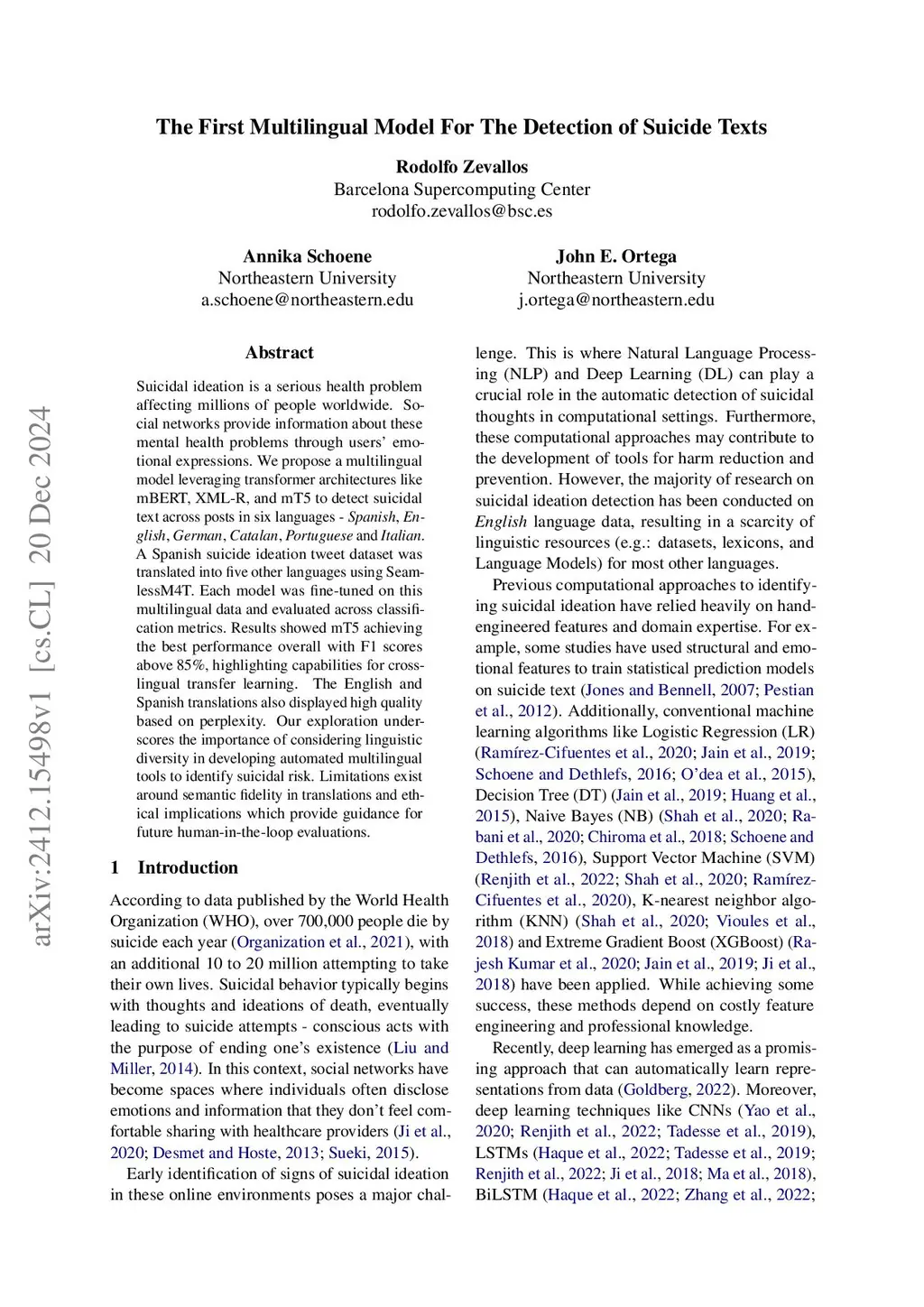 Suicidal ideation is a serious health problem affecting millions of people worldwide. Social networks provide information about these mental health problems through users' emotional expressions. We propose a multilingual model leveraging transformer architectures like mBERT, XML-R, and mT5 to detect suicidal text across posts in six languages - Spanish, English, German, Catalan, Portuguese and Italian. A Spanish suicide ideation tweet dataset was translated into five other languages using SeamlessM4T. Each model was fine-tuned on this multilingual data and evaluated across classification metrics. Results showed mT5 achieving the best performance overall with F1 scores above 85%, highlighting capabilities for cross-lingual transfer learning. The English and Spanish translations also displayed high quality based on perplexity. Our exploration underscores the importance of considering linguistic diversity in developing automated multilingual tools to identify suicidal risk. Limitations exist around semantic fidelity in translations and ethical implications which provide guidance for future human-in-the-loop evaluations.