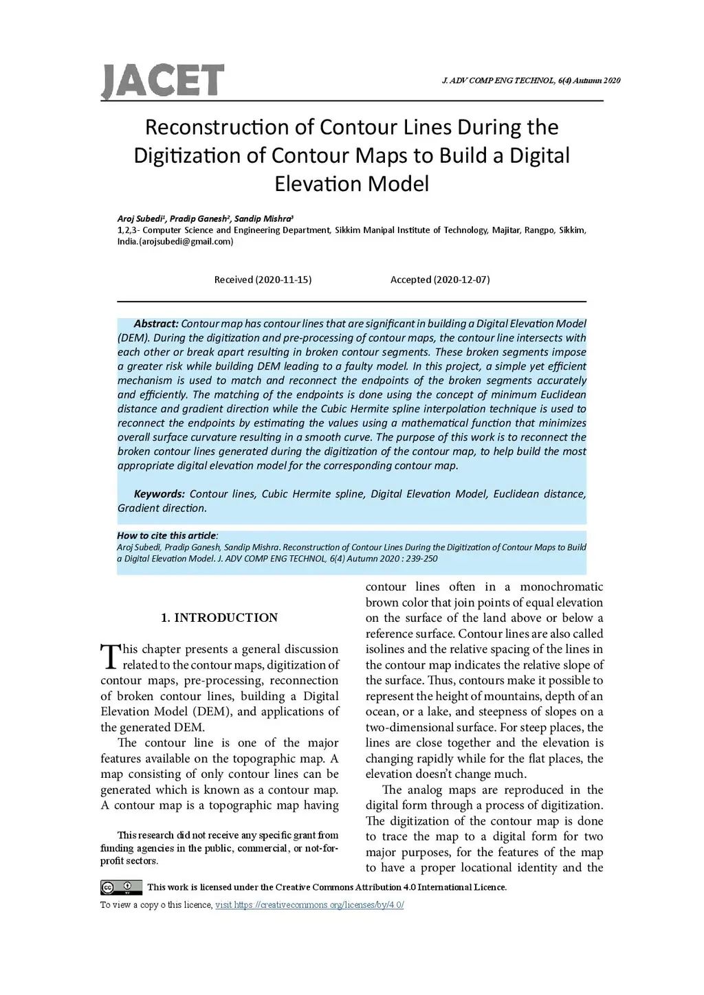 Contour map has contour lines that are significant in building a Digital Elevation Model (DEM). During the digitization and pre-processing of contour maps, the contour line intersects with each other or break apart resulting in broken contour segments. These broken segments impose a greater risk while building DEM leading to a faulty model. In this project, a simple yet efficient mechanism is used to match and reconnect the endpoints of the broken segments accurately and efficiently. The matching of the endpoints is done using the concept of minimum Euclidean distance and gradient direction while the Cubic Hermite spline interpolation technique is used to reconnect the endpoints by estimating the values using a mathematical function that minimizes overall surface curvature resulting in a smooth curve. The purpose of this work is to reconnect the broken contour lines generated during the digitization of the contour map, to help build the most appropriate digital elevation model for the corresponding contour map.