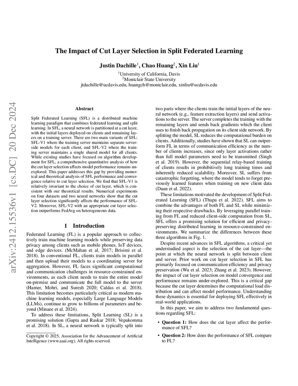 Split Federated Learning (SFL) is a distributed machine learning paradigm that combines federated learning and split learning. In SFL, a neural network is partitioned at a cut layer, with the initial layers deployed on clients and remaining layers on a training server. There are two main variants of SFL: SFL-V1 where the training server maintains separate server-side models for each client, and SFL-V2 where the training server maintains a single shared model for all clients. While existing studies have focused on algorithm development for SFL, a comprehensive quantitative analysis of how the cut layer selection affects model performance remains unexplored. This paper addresses this gap by providing numerical and theoretical analysis of SFL performance and convergence relative to cut layer selection. We find that SFL-V1 is relatively invariant to the choice of cut layer, which is consistent with our theoretical results. Numerical experiments on four datasets and two neural networks show that the cut layer selection significantly affects the performance of SFL-V2. Moreover, SFL-V2 with an appropriate cut layer selection outperforms FedAvg on heterogeneous data.