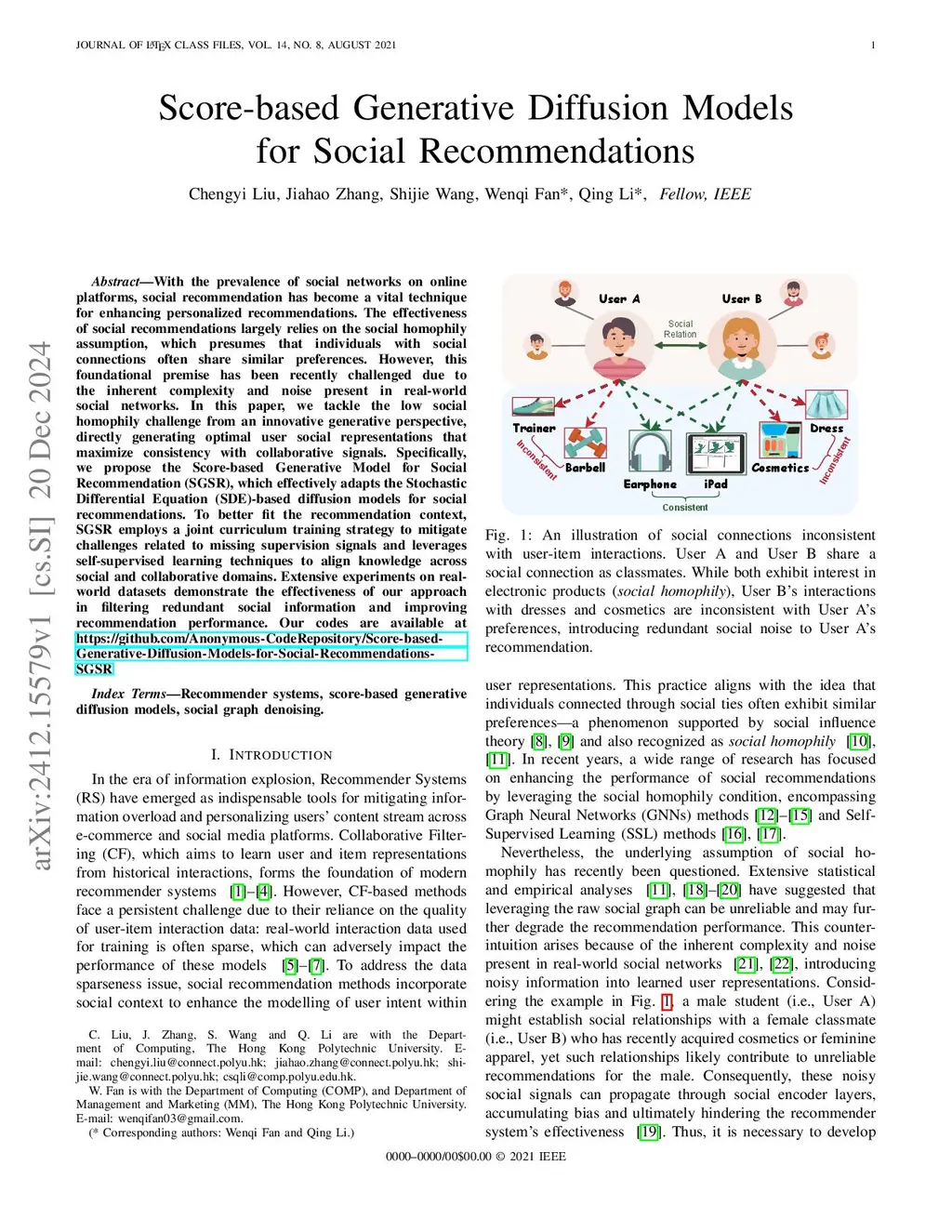 Score-based Generative Diffusion Models for Social Recommendations