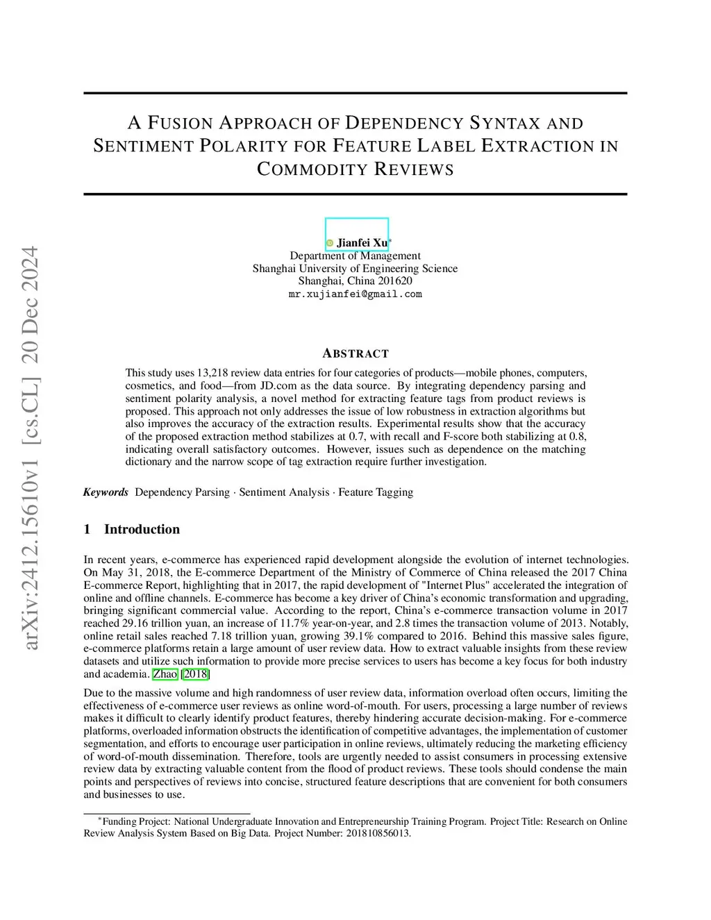 This study analyzes 13,218 product reviews from JD.com, covering four categories: mobile phones, computers, cosmetics, and food. A novel method for feature label extraction is proposed by integrating dependency parsing and sentiment polarity analysis. The proposed method addresses the challenges of low robustness in existing extraction algorithms and significantly enhances extraction accuracy. Experimental results show that the method achieves an accuracy of 0.7, with recall and F-score both stabilizing at 0.8, demonstrating its effectiveness. However, challenges such as dependence on matching dictionaries and the limited scope of extracted feature tags require further investigation in future research.