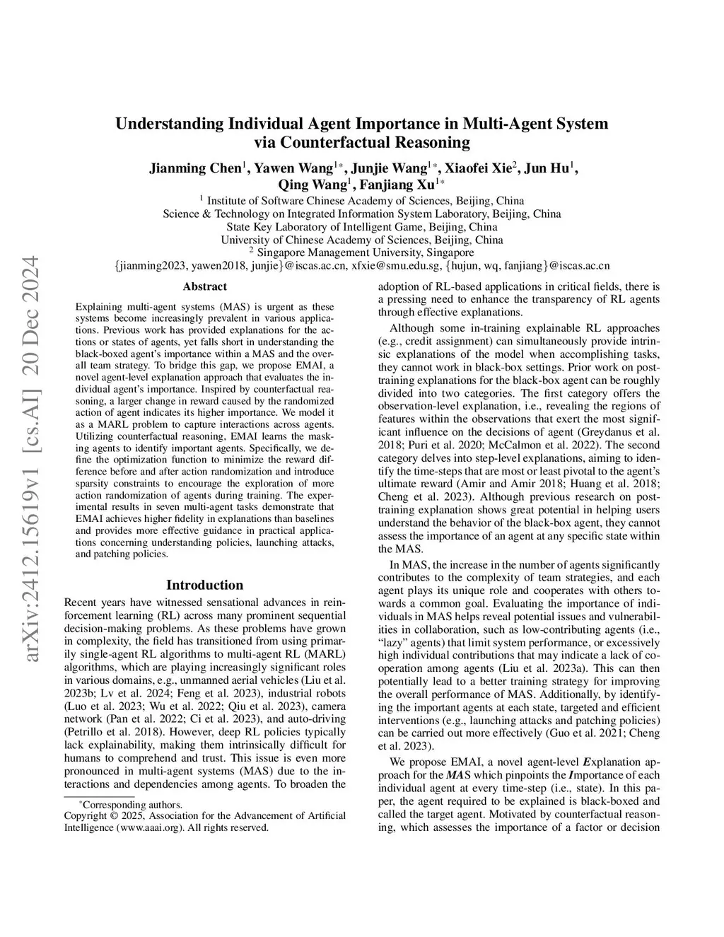 Explaining multi-agent systems (MAS) is urgent as these systems become increasingly prevalent in various applications. Previous work has proveided explanations for the actions or states of agents, yet falls short in understanding the black-boxed agent's importance within a MAS and the overall team strategy. To bridge this gap, we propose EMAI, a novel agent-level explanation approach that evaluates the individual agent's importance. Inspired by counterfactual reasoning, a larger change in reward caused by the randomized action of agent indicates its higher importance. We model it as a MARL problem to capture interactions across agents. Utilizing counterfactual reasoning, EMAI learns the masking agents to identify important agents. Specifically, we define the optimization function to minimize the reward difference before and after action randomization and introduce sparsity constraints to encourage the exploration of more action randomization of agents during training. The experimental results in seven multi-agent tasks demonstratee that EMAI achieves higher fidelity in explanations than baselines and provides more effective guidance in practical applications concerning understanding policies, launching attacks, and patching policies.