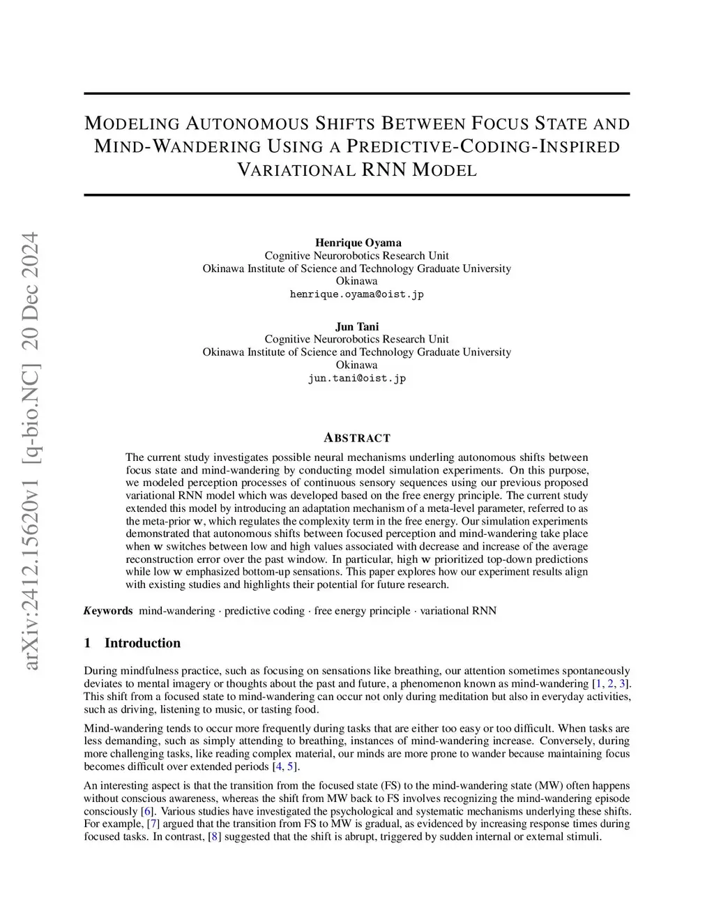 The current study investigates possible neural mechanisms underling autonomous shifts between focus state and mind-wandering by conducting model simulation experiments. On this purpose, we modeled perception processes of continuous sensory sequences using our previous proposed variational RNN model which was developed based on the free energy principle. The current study extended this model by introducing an adaptation mechanism of a meta-level parameter, referred to as the meta-prior , which regulates the complexity term in the free energy. Our simulation experiments demonstrated that autonomous shifts between focused perception and mind-wandering take place when switches between low and high values associated with decrease and increase of the average reconstruction error over the past window. In particular, high prioritized top-down predictions while low emphasized bottom-up sensations. This paper explores how our experiment results align with existing studies and highlights their potential for future research.