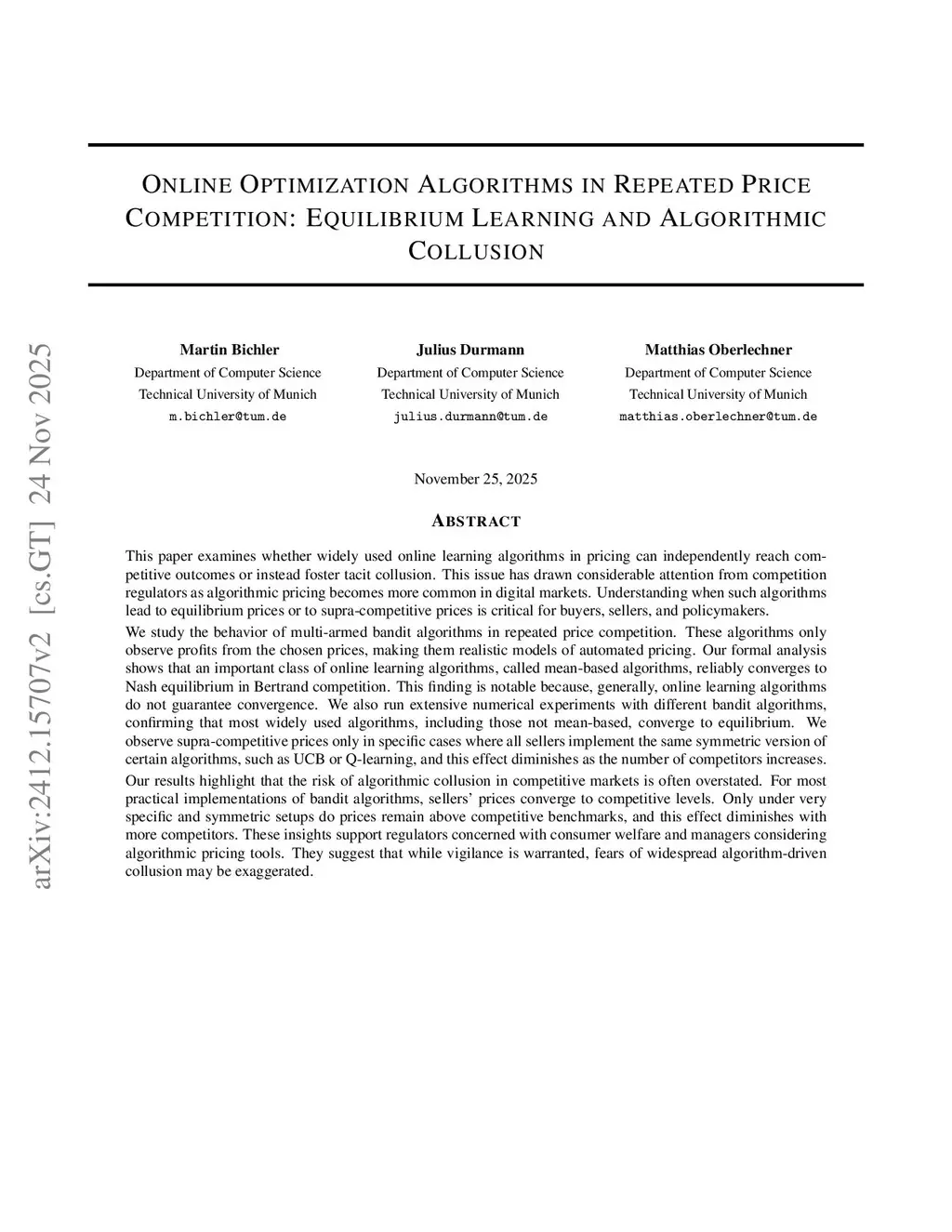 This paper examines whether widely used online learning algorithms in pricing can independently reach competitive outcomes or instead foster tacit collusion. This issue has drawn considerable attention from competition regulators as algorithmic pricing becomes more common in digital markets. Understanding when such algorithms lead to equilibrium prices or to supra-competitive prices is critical for buyers, sellers, and policymakers.We study the behavior of multi-armed bandit algorithms in repeated price competition. These algorithms only observe profits from the chosen prices, making them realistic models of automated pricing. Our formal analysis shows that an important class of online learning algorithms, called mean-based algorithms, reliably converges to Nash equilibrium in Bertrand competition. This finding is notable because, generally, online learning algorithms do not guarantee convergence. We also run extensive numerical experiments with different bandit algorithms, confirming that most widely used algorithms, including those not mean-based, converge to equilibrium. We observe supra-competitive prices only in specific cases where all sellers implement the same symmetric version of certain algorithms, such as UCB or Q-learning, and this effect diminishes as the number of competitors increases.Our results highlight that the risk of algorithmic collusion in competitive markets is often overstated. For most practical implementations of bandit algorithms, sellers' prices converge to competitive levels. Only under very specific and symmetric setups do prices remain above competitive benchmarks, and this effect diminishes with more competitors. These insights support regulators concerned with consumer welfare and managers considering algorithmic pricing tools. They suggest that while vigilance is warranted, fears of widespread algorithm-driven collusion may be exaggerated.