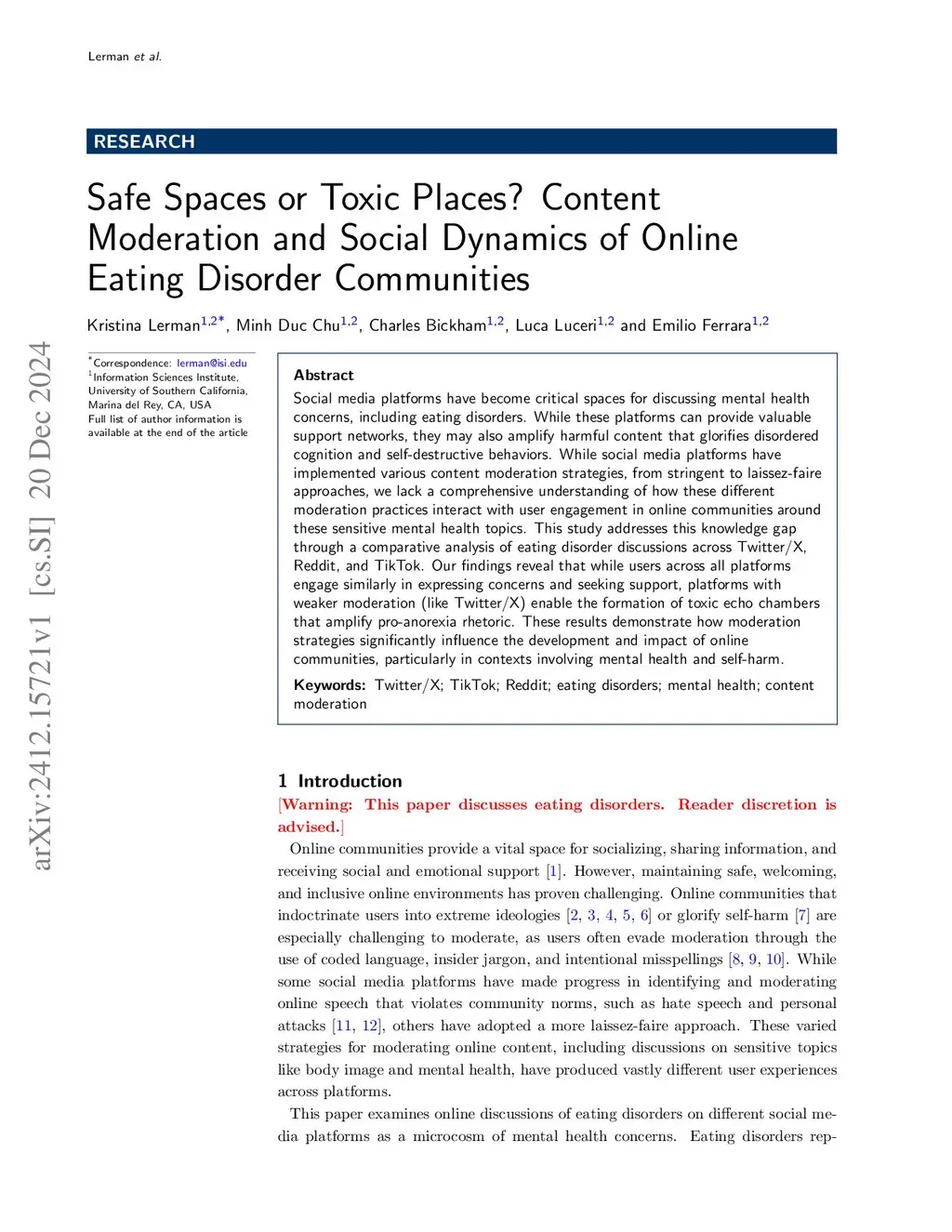 Social media platforms have become critical spaces for discussing mental health concerns, including eating disorders. While these platforms can provide valuable support networks, they may also amplify harmful content that glorifies disordered cognition and self-destructive behaviors. While social media platforms have implemented various content moderation strategies, from stringent to laissez-faire approaches, we lack a comprehensive understanding of how these different moderation practices interact with user engagement in online communities around these sensitive mental health topics. This study addresses this knowledge gap through a comparative analysis of eating disorder discussions across Twitter/X, Reddit, and TikTok. Our findings reveal that while users across all platforms engage similarly in expressing concerns and seeking support, platforms with weaker moderation (like Twitter/X) enable the formation of toxic echo chambers that amplify pro-anorexia rhetoric. These results demonstrate how moderation strategies significantly influence the development and impact of online communities, particularly in contexts involving mental health and self-harm.