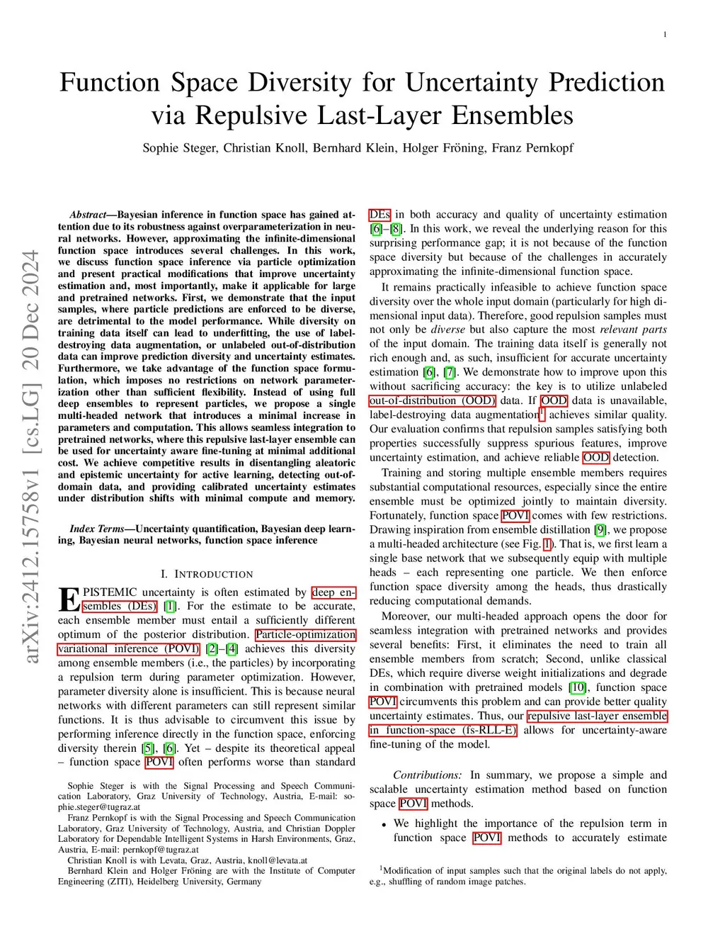 Bayesian inference in function space has gained attention due to its robustness against overparameterization in neural networks. However, approximating the infinite-dimensional function space introduces several challenges. In this work, we discuss function space inference via particle optimization and present practical modifications that improve uncertainty estimation and, most importantly, make it applicable for large and pretrained networks. First, we demonstrate that the input samples, where particle predictions are enforced to be diverse, are detrimental to the model performance. While diversity on training data itself can lead to underfitting, the use of label-destroying data augmentation, or unlabeled out-of-distribution data can improve prediction diversity and uncertainty estimates. Furthermore, we take advantage of the function space formulation, which imposes no restrictions on network parameterization other than sufficient flexibility. Instead of using full deep ensembles to represent particles, we propose a single multi-headed network that introduces a minimal increase in parameters and computation. This allows seamless integration to pretrained networks, where this repulsive last-layer ensemble can be used for uncertainty aware fine-tuning at minimal additional cost. We achieve competitive results in disentangling aleatoric and epistemic uncertainty for active learning, detecting out-of-domain data, and providing calibrated uncertainty estimates under distribution shifts with minimal compute and memory.