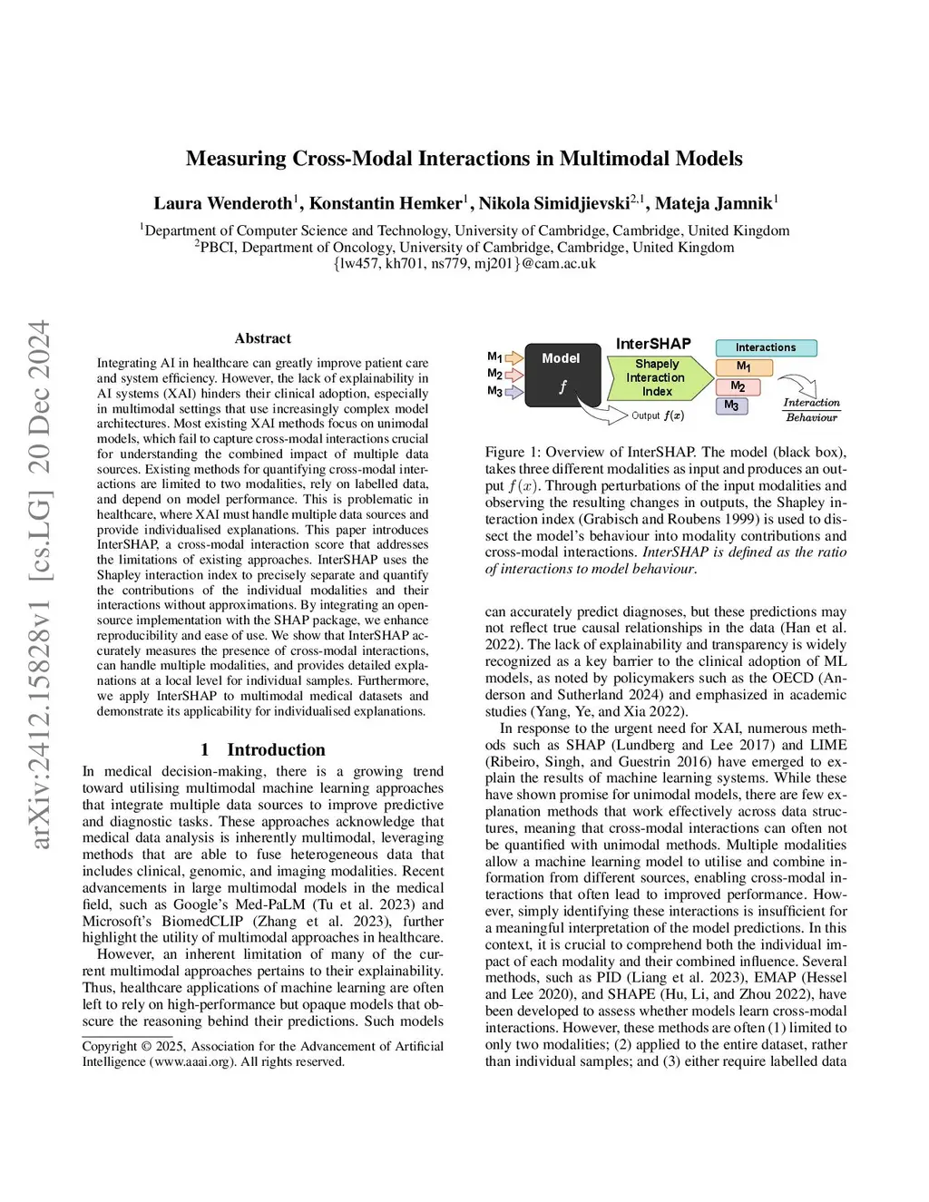 Integrating AI in healthcare can greatly improve patient care and system efficiency. However, the lack of explainability in AI systems (XAI) hinders their clinical adoption, especially in multimodal settings that use increasingly complex model architectures. Most existing XAI methods focus on unimodal models, which fail to capture cross-modal interactions crucial for understanding the combined impact of multiple data sources. Existing methods for quantifying cross-modal interactions are limited to two modalities, rely on labelled data, and depend on model performance. This is problematic in healthcare, where XAI must handle multiple data sources and provide individualised explanations. This paper introduces InterSHAP, a cross-modal interaction score that addresses the limitations of existing approaches. InterSHAP uses the Shapley interaction index to precisely separate and quantify the contributions of the individual modalities and their interactions without approximations. By integrating an open-source implementation with the SHAP package, we enhance reproducibility and ease of use. We show that InterSHAP accurately measures the presence of cross-modal interactions, can handle multiple modalities, and provides detailed explanations at a local level for individual samples. Furthermore, we apply InterSHAP to multimodal medical datasets and demonstrate its applicability for individualised explanations.