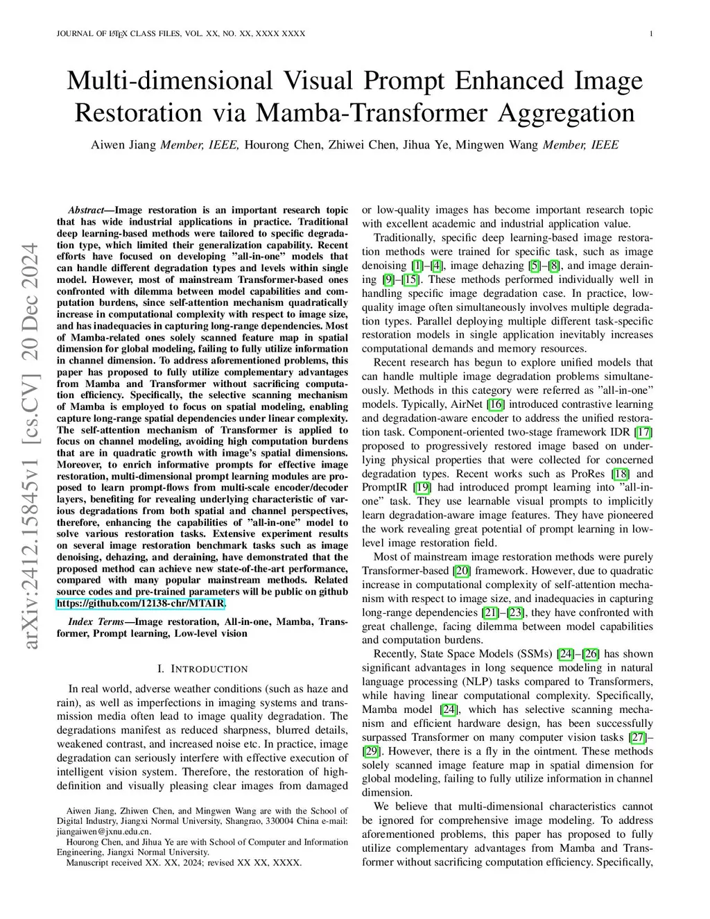 Recent efforts on image restoration have focused on developing "all-in-one" models that can handle different degradation types and levels within single model. However, most of mainstream Transformer-based ones confronted with dilemma between model capabilities and computation burdens, since self-attention mechanism quadratically increase in computational complexity with respect to image size, and has inadequacies in capturing long-range dependencies. Most of Mamba-related ones solely scanned feature map in spatial dimension for global modeling, failing to fully utilize information in channel dimension. To address aforementioned problems, this paper has proposed to fully utilize complementary advantages from Mamba and Transformer without sacrificing computation efficiency. Specifically, the selective scanning mechanism of Mamba is employed to focus on spatial modeling, enabling capture long-range spatial dependencies under linear complexity. The self-attention mechanism of Transformer is applied to focus on channel modeling, avoiding high computation burdens that are in quadratic growth with image's spatial dimensions. Moreover, to enrich informative prompts for effective image restoration, multi-dimensional prompt learning modules are proposed to learn prompt-flows from multi-scale encoder/decoder layers, benefiting for revealing underlying characteristic of various degradations from both spatial and channel perspectives, therefore, enhancing the capabilities of "all-in-one" model to solve various restoration tasks. Extensive experiment results on several image restoration benchmark tasks such as image denoising, dehazing, and deraining, have demonstrated that the proposed method can achieve new state-of-the-art performance, compared with many popular mainstream methods. Related source codes and pre-trained parameters will be public on github https://github.com/12138-chr/MTAIR.