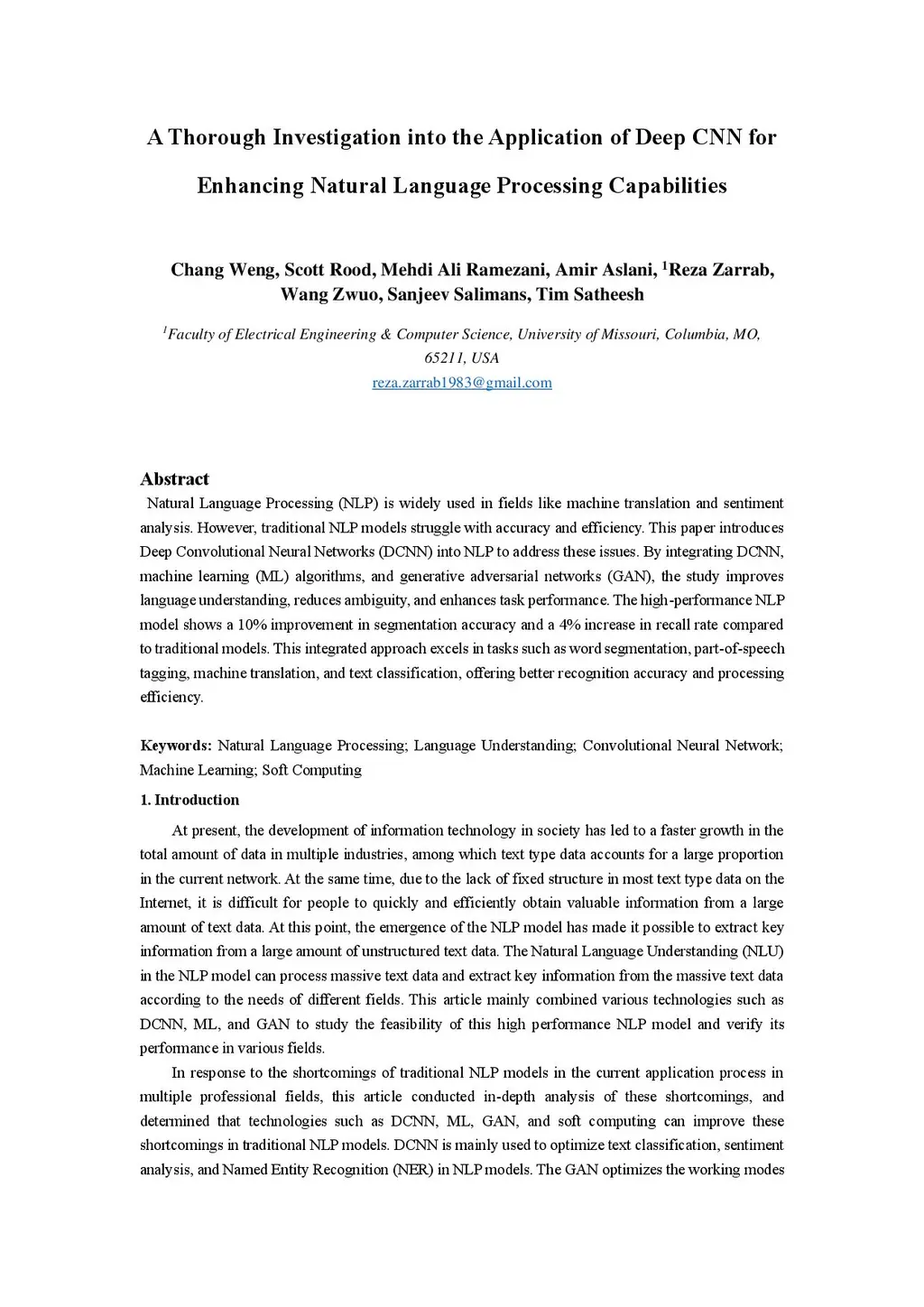 Natural Language Processing (NLP) is widely used in fields like machine translation and sentiment analysis. However, traditional NLP models struggle with accuracy and efficiency. This paper introduces Deep Convolutional Neural Networks (DCNN) into NLP to address these issues. By integrating DCNN, machine learning (ML) algorithms, and generative adversarial networks (GAN), the study improves language understanding, reduces ambiguity, and enhances task performance. The high-performance NLP model shows a 10% improvement in segmentation accuracy and a 4% increase in recall rate compared to traditional models. This integrated approach excels in tasks such as word segmentation, part-of-speech tagging, machine translation, and text classification, offering better recognition accuracy and processing efficiency.