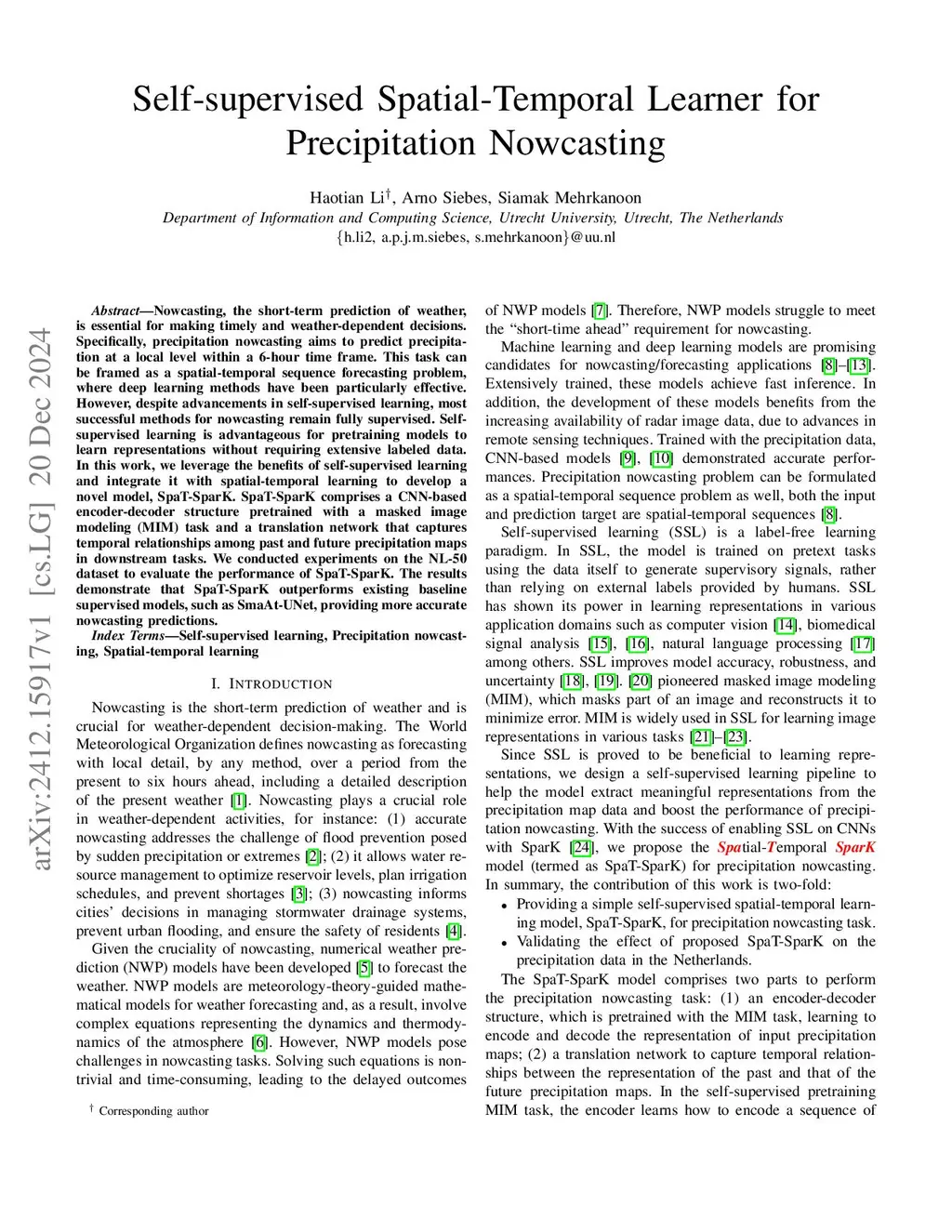 Nowcasting, the short-term prediction of weather, is essential for making timely and weather-dependent decisions. Specifically, precipitation nowcasting aims to predict precipitation at a local level within a 6-hour time frame. This task can be framed as a spatial-temporal sequence forecasting problem, where deep learning methods have been particularly effective. However, despite advancements in self-supervised learning, most successful methods for nowcasting remain fully supervised. Self-supervised learning is advantageous for pretraining models to learn representations without requiring extensive labeled data. In this work, we leverage the benefits of self-supervised learning and integrate it with spatial-temporal learning to develop a novel model, SpaT-SparK. SpaT-SparK comprises a CNN-based encoder-decoder structure pretrained with a masked image modeling (MIM) task and a translation network that captures temporal relationships among past and future precipitation maps in downstream tasks. We conducted experiments on the NL-50 dataset to evaluate the performance of SpaT-SparK. The results demonstrate that SpaT-SparK outperforms existing baseline supervised models, such as SmaAt-UNet, providing more accurate nowcasting predictions.