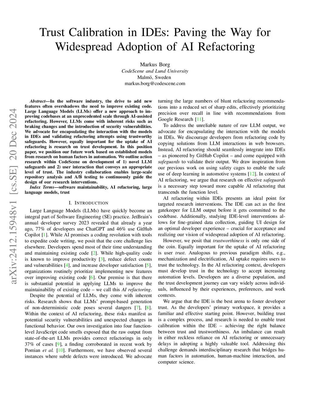 In the software industry, the drive to add new features often overshadows the need to improve existing code. Large Language Models (LLMs) offer a new approach to improving codebases at an unprecedented scale through AI-assisted refactoring. However, LLMs come with inherent risks such as braking changes and the introduction of security vulnerabilities. We advocate for encapsulating the interaction with the models in IDEs and validating refactoring attempts using trustworthy safeguards. However, equally important for the uptake of AI refactoring is research on trust development. In this position paper, we position our future work based on established models from research on human factors in automation. We outline action research within CodeScene on development of 1) novel LLM safeguards and 2) user interaction that conveys an appropriate level of trust. The industry collaboration enables large-scale repository analysis and A/B testing to continuously guide the design of our research interventions.