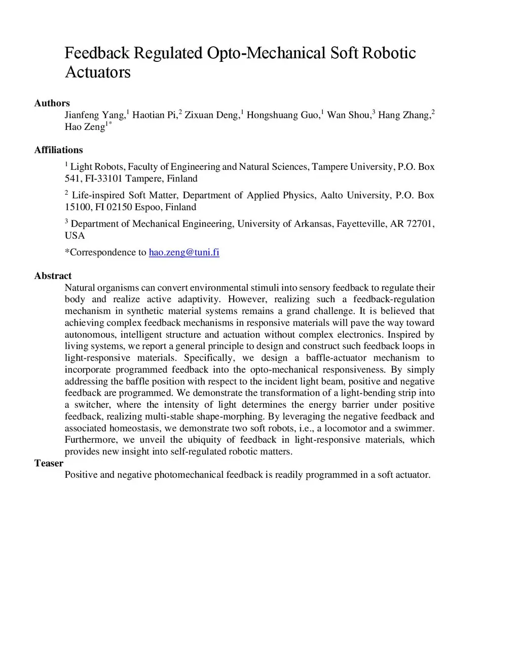 Feedback Regulated Opto-Mechanical Soft Robotic Actuators