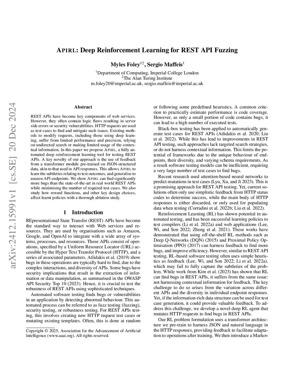 REST APIs have become key components of web services. However, they often contain logic flaws resulting in server side errors or security vulnerabilities. HTTP requests are used as test cases to find and mitigate such issues. Existing methods to modify requests, including those using deep learning, suffer from limited performance and precision, relying on undirected search or making limited usage of the contextual information. In this paper we propose APIRL, a fully automated deep reinforcement learning tool for testing REST APIs. A key novelty of our approach is the use of feedback from a transformer module pre-trained on JSON-structured data, akin to that used in API responses. This allows APIRL to learn the subtleties relating to test outcomes, and generalise to unseen API endpoints. We show APIRL can find significantly more bugs than the state-of-the-art in real world REST APIs while minimising the number of required test cases. We also study how reward functions, and other key design choices, affect learnt policies in a thorough ablation study.