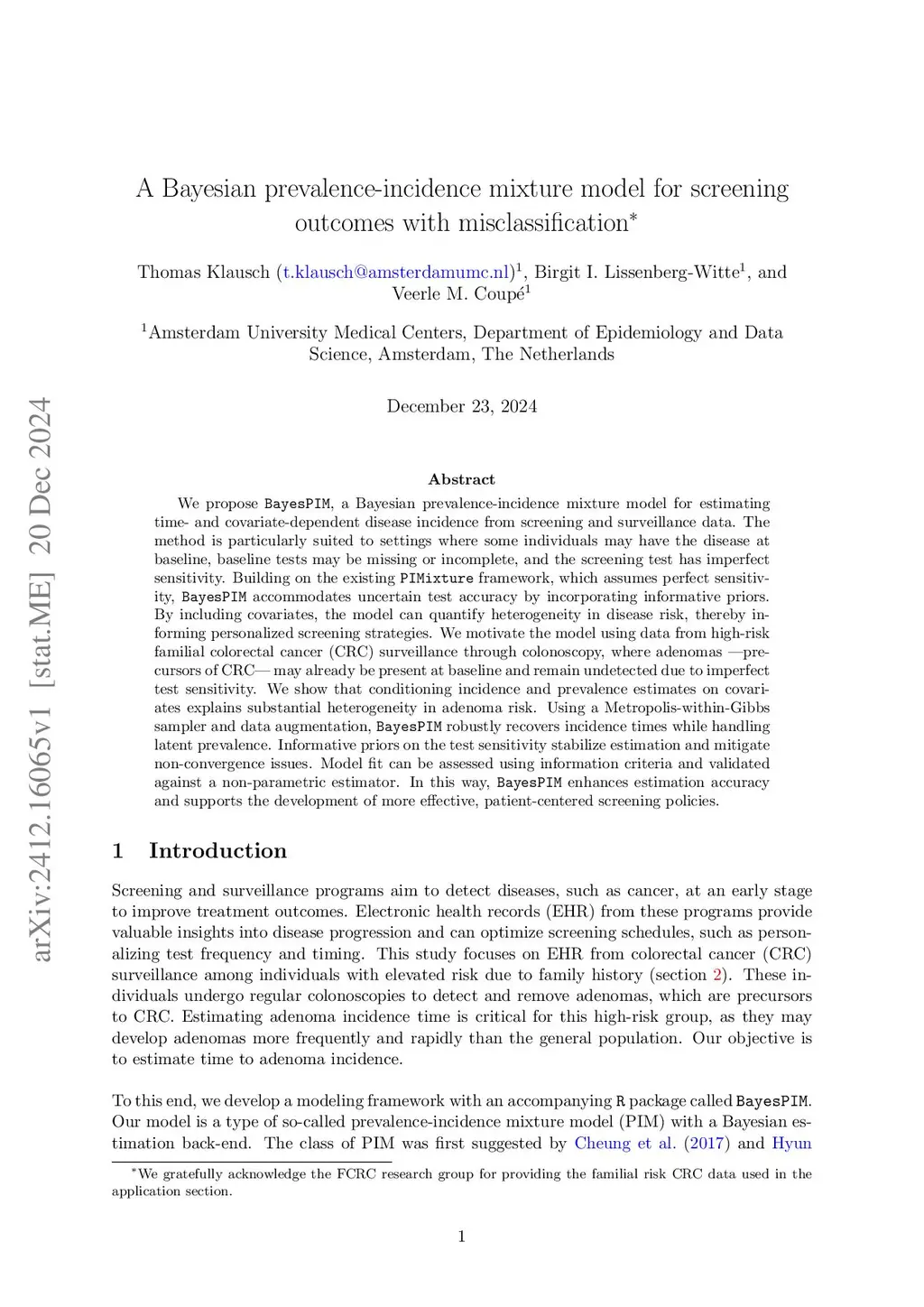 We propose BayesPIM, a Bayesian prevalence-incidence mixture model for estimating time- and covariate-dependent disease incidence from screening and surveillance data. The method is particularly suited to settings where some individuals may have the disease at baseline, baseline tests may be missing or incomplete, and the screening test has imperfect sensitivity. Building on the existing PIMixture framework, which assumes perfect sensitivity, BayesPIM accommodates uncertain test accuracy by incorporating informative priors. By including covariates, the model can quantify heterogeneity in disease risk, thereby informing personalized screening strategies. We motivate the model using data from high-risk familial colorectal cancer (CRC) surveillance through colonoscopy, where adenomas - precursors of CRC - may already be present at baseline and remain undetected due to imperfect test sensitivity. We show that conditioning incidence and prevalence estimates on covariates explains substantial heterogeneity in adenoma risk. Using a Metropolis-within-Gibbs sampler and data augmentation, BayesPIM robustly recovers incidence times while handling latent prevalence. Informative priors on the test sensitivity stabilize estimation and mitigate non-convergence issues. Model fit can be assessed using information criteria and validated against a non-parametric estimator. In this way, BayesPIM enhances estimation accuracy and supports the development of more effective, patient-centered screening policies.