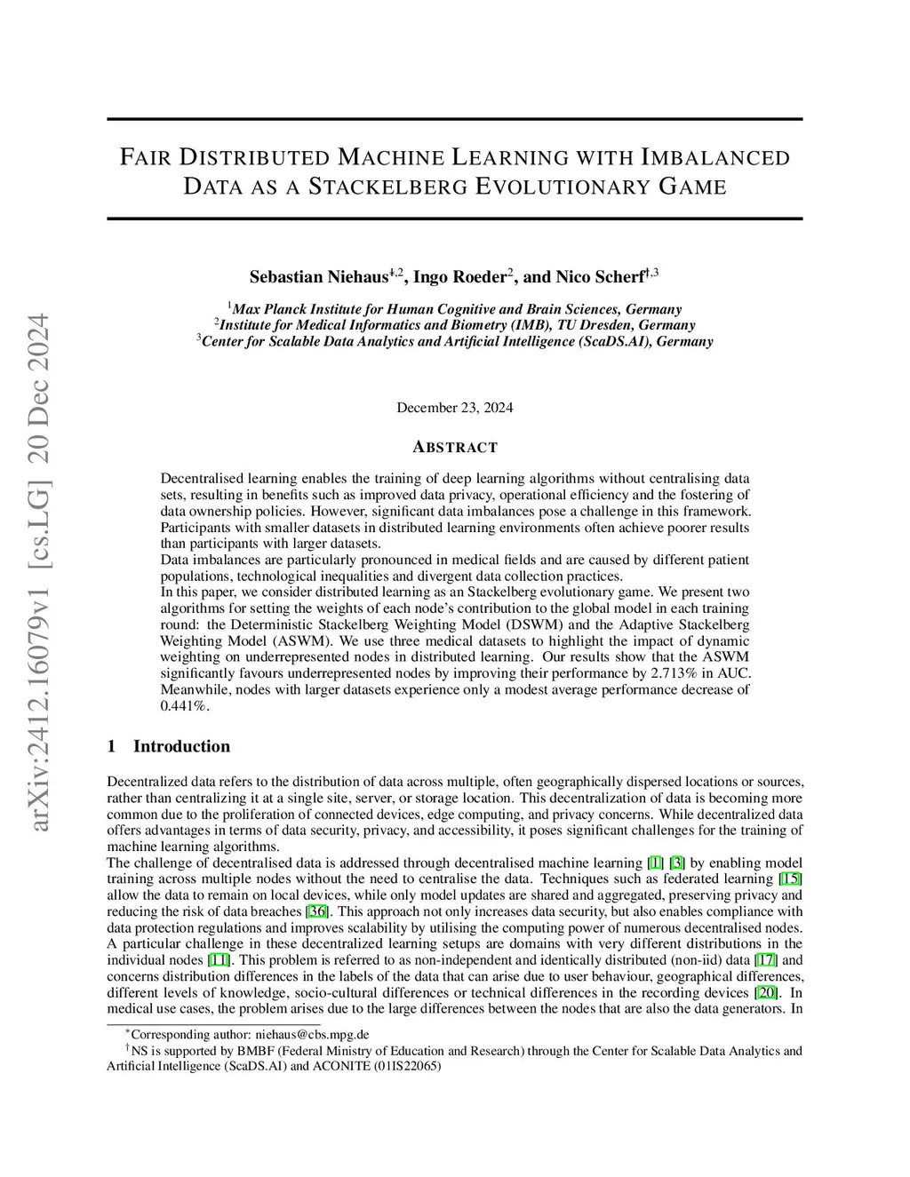 Decentralised learning enables the training of deep learning algorithms without centralising data sets, resulting in benefits such as improved data privacy, operational efficiency and the fostering of data ownership policies. However, significant data imbalances pose a challenge in this framework. Participants with smaller datasets in distributed learning environments often achieve poorer results than participants with larger datasets. Data imbalances are particularly pronounced in medical fields and are caused by different patient populations, technological inequalities and divergent data collection practices. In this paper, we consider distributed learning as an Stackelberg evolutionary game. We present two algorithms for setting the weights of each node's contribution to the global model in each training round: the Deterministic Stackelberg Weighting Model (DSWM) and the Adaptive Stackelberg Weighting Model (ASWM). We use three medical datasets to highlight the impact of dynamic weighting on underrepresented nodes in distributed learning. Our results show that the ASWM significantly favours underrepresented nodes by improving their performance by 2.713% in AUC. Meanwhile, nodes with larger datasets experience only a modest average performance decrease of 0.441%.