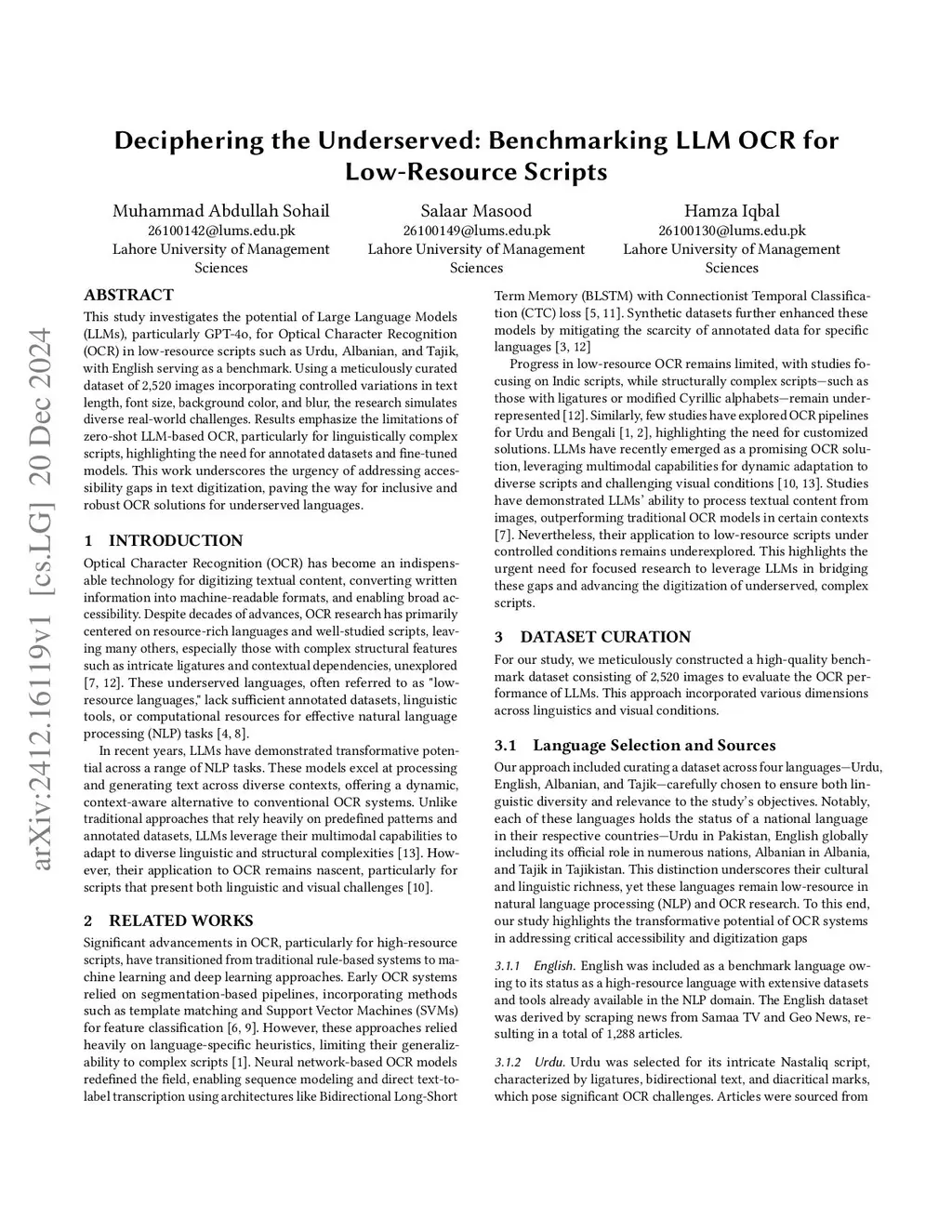 This study investigates the potential of Large Language Models (LLMs), particularly GPT-4o, for Optical Character Recognition (OCR) in low-resource scripts such as Urdu, Albanian, and Tajik, with English serving as a benchmark. Using a meticulously curated dataset of 2,520 images incorporating controlled variations in text length, font size, background color, and blur, the research simulates diverse real-world challenges. Results emphasize the limitations of zero-shot LLM-based OCR, particularly for linguistically complex scripts, highlighting the need for annotated datasets and fine-tuned models. This work underscores the urgency of addressing accessibility gaps in text digitization, paving the way for inclusive and robust OCR solutions for underserved languages.