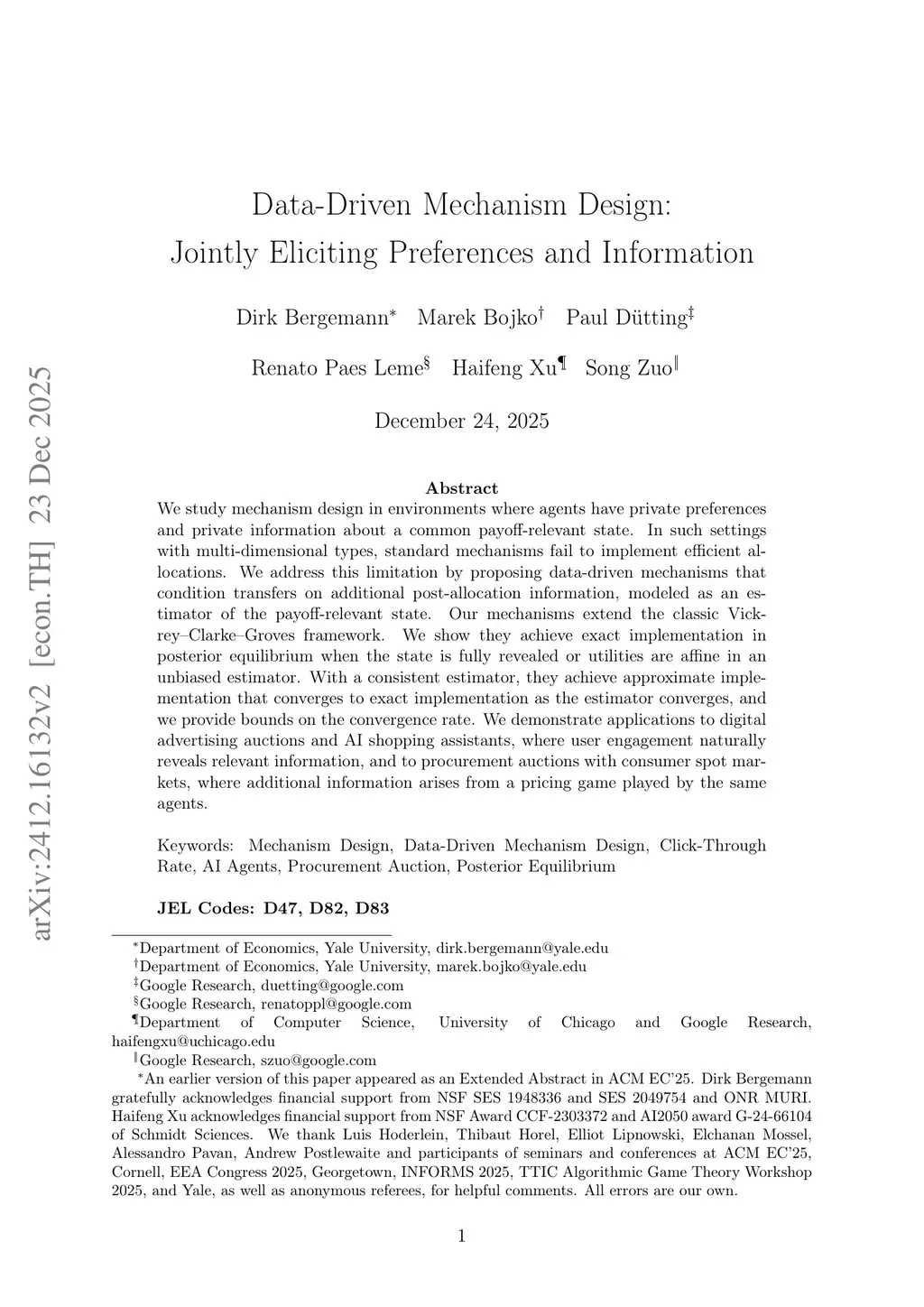 We study mechanism design in environments where agents have private preferences and private information about a common payoff-relevant state. In such settings with multi-dimensional types, standard mechanisms fail to implement efficient allocations. We address this limitation by proposing data-driven mechanisms that condition transfers on additional post-allocation information, modeled as an estimator of the payoff-relevant state. Our mechanisms extend the classic Vickrey-Clarke-Groves framework. We show they achieve exact implementation in posterior equilibrium when the state is fully revealed or utilities are affine in an unbiased estimator. With a consistent estimator, they achieve approximate implementation that converges to exact implementation as the estimator converges, and we provide bounds on the convergence rate. We demonstrate applications to digital advertising auctions and AI shopping assistants, where user engagement naturally reveals relevant information, and to procurement auctions with consumer spot markets, where additional information arises from a pricing game played by the same agents.