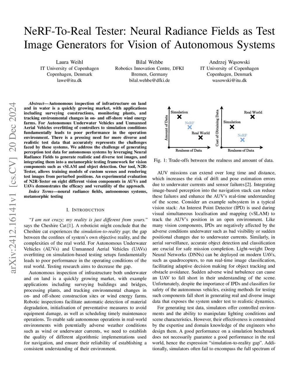 Autonomous inspection of infrastructure on land and in water is a quickly growing market, with applications including surveying constructions, monitoring plants, and tracking environmental changes in on- and off-shore wind energy farms. For Autonomous Underwater Vehicles and Unmanned Aerial Vehicles overfitting of controllers to simulation conditions fundamentally leads to poor performance in the operation environment. There is a pressing need for more diverse and realistic test data that accurately represents the challenges faced by these systems. We address the challenge of generating perception test data for autonomous systems by leveraging Neural Radiance Fields to generate realistic and diverse test images, and integrating them into a metamorphic testing framework for vision components such as vSLAM and object detection. Our tool, N2R-Tester, allows training models of custom scenes and rendering test images from perturbed positions. An experimental evaluation of N2R-Tester on eight different vision components in AUVs and UAVs demonstrates the efficacy and versatility of the approach.