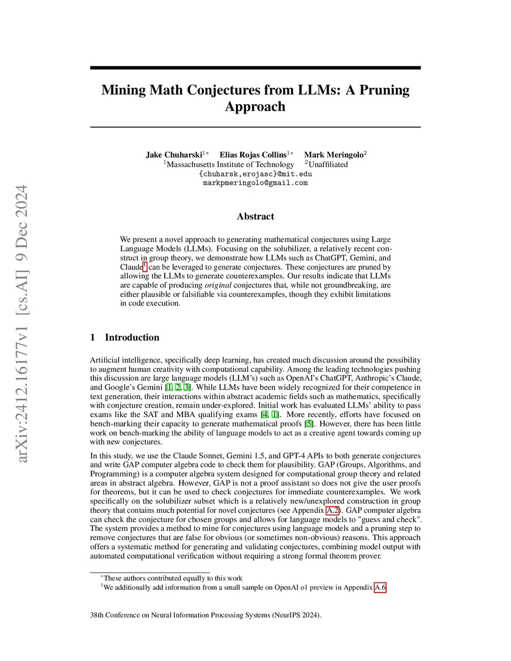 We present a novel approach to generating mathematical conjectures using Large Language Models (LLMs). Focusing on the solubilizer, a relatively recent construct in group theory, we demonstrate how LLMs such as ChatGPT, Gemini, and Claude can be leveraged to generate conjectures. These conjectures are pruned by allowing the LLMs to generate counterexamples. Our results indicate that LLMs are capable of producing original conjectures that, while not groundbreaking, are either plausible or falsifiable via counterexamples, though they exhibit limitations in code execution.