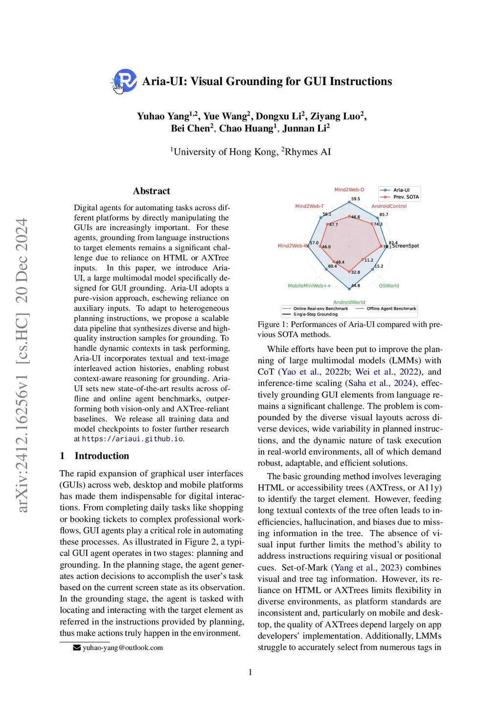 Digital agents for automating tasks across different platforms by directly manipulating the GUIs are increasingly important. For these agents, grounding from language instructions to target elements remains a significant challenge due to reliance on HTML or AXTree inputs. In this paper, we introduce Aria-UI, a large multimodal model specifically designed for GUI grounding. Aria-UI adopts a pure-vision approach, eschewing reliance on auxiliary inputs. To adapt to heterogeneous planning instructions, we propose a scalable data pipeline that synthesizes diverse and high-quality instruction samples for grounding. To handle dynamic contexts in task performing, Aria-UI incorporates textual and text-image interleaved action histories, enabling robust context-aware reasoning for grounding. Aria-UI sets new state-of-the-art results across offline and online agent benchmarks, outperforming both vision-only and AXTree-reliant baselines. We release all training data and model checkpoints to foster further research atthis https URL.