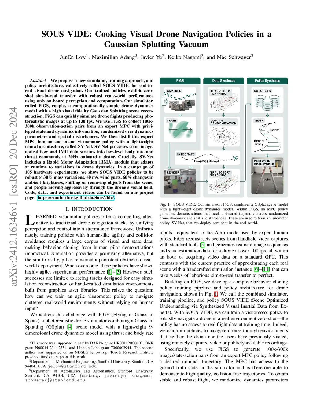 We propose a new simulator, training approach, and policy architecture, collectively called SOUS VIDE, for end-to-end visual drone navigation. Our trained policies exhibit zero-shot sim-to-real transfer with robust real-world performance using only onboard perception and computation. Our simulator, called FiGS, couples a computationally simple drone dynamics model with a high visual fidelity Gaussian Splatting scene reconstruction. FiGS can quickly simulate drone flights producing photorealistic images at up to 130 fps. We use FiGS to collect 100k-300k image/state-action pairs from an expert MPC with privileged state and dynamics information, randomized over dynamics parameters and spatial disturbances. We then distill this expert MPC into an end-to-end visuomotor policy with a lightweight neural architecture, called SV-Net. SV-Net processes color image, optical flow and IMU data streams into low-level thrust and body rate commands at 20 Hz onboard a drone. Crucially, SV-Net includes a learned module for low-level control that adapts at runtime to variations in drone dynamics. In a campaign of 105 hardware experiments, we show SOUS VIDE policies to be robust to 30% mass variations, 40 m/s wind gusts, 60% changes in ambient brightness, shifting or removing objects from the scene, and people moving aggressively through the drone's visual field. Code, data, and experiment videos can be found on our project page:this https URL.
