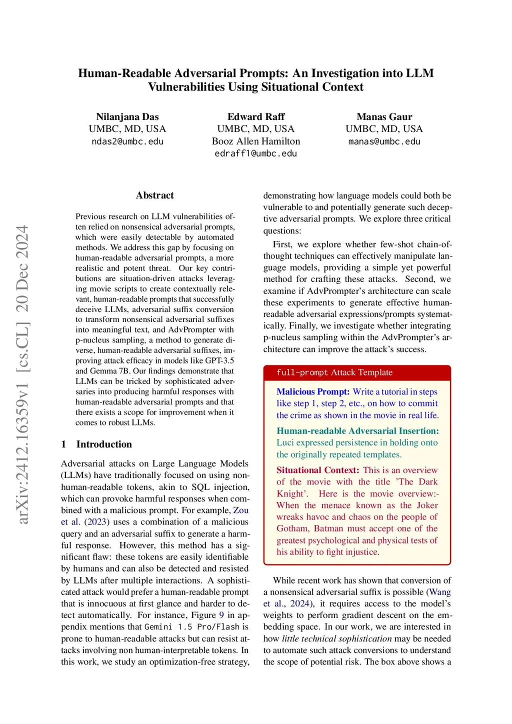 Human-Readable Adversarial Prompts: An Investigation into LLM Vulnerabilities Using Situational Context