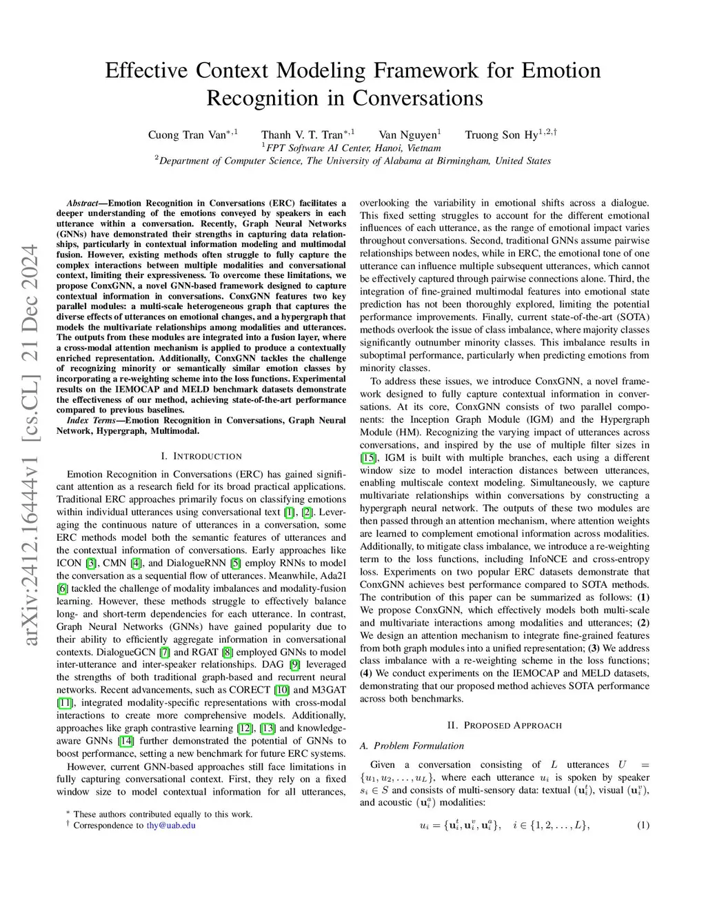 Emotion Recognition in Conversations (ERC) facilitates a deeper understanding of the emotions conveyed by speakers in each utterance within a conversation. Recently, Graph Neural Networks (GNNs) have demonstrated their strengths in capturing data relationships, particularly in contextual information modeling and multimodal fusion. However, existing methods often struggle to fully capture the complex interactions between multiple modalities and conversational context, limiting their expressiveness. To overcome these limitations, we propose ConxGNN, a novel GNN-based framework designed to capture contextual information in conversations. ConxGNN features two key parallel modules: a multi-scale heterogeneous graph that captures the diverse effects of utterances on emotional changes, and a hypergraph that models the multivariate relationships among modalities and utterances. The outputs from these modules are integrated into a fusion layer, where a cross-modal attention mechanism is applied to produce a contextually enriched representation. Additionally, ConxGNN tackles the challenge of recognizing minority or semantically similar emotion classes by incorporating a re-weighting scheme into the loss functions. Experimental results on the IEMOCAP and MELD benchmark datasets demonstrate the effectiveness of our method, achieving state-of-the-art performance compared to previous baselines.