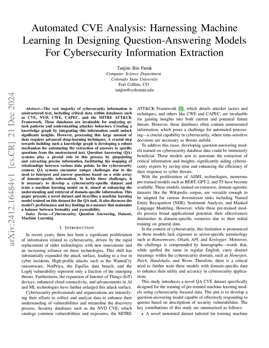 The vast majority of cybersecurity information is unstructured text, including critical data within databases such as CVE, NVD, CWE, CAPEC, and the MITRE ATT&CK Framework. These databases are invaluable for analyzing attack patterns and understanding attacker behaviors. Creating a knowledge graph by integrating this information could unlock significant insights. However, processing this large amount of data requires advanced deep-learning techniques. A crucial step towards building such a knowledge graph is developing a robust mechanism for automating the extraction of answers to specific questions from the unstructured text. Question Answering (QA) systems play a pivotal role in this process by pinpointing and extracting precise information, facilitating the mapping of relationships between various data points. In the cybersecurity context, QA systems encounter unique challenges due to the need to interpret and answer questions based on a wide array of domain-specific information. To tackle these challenges, it is necessary to develop a cybersecurity-specific dataset and train a machine learning model on it, aimed at enhancing the understanding and retrieval of domain-specific information. This paper presents a novel dataset and describes a machine learning model trained on this dataset for the QA task. It also discusses the model's performance and key findings in a manner that maintains a balance between formality and accessibility.