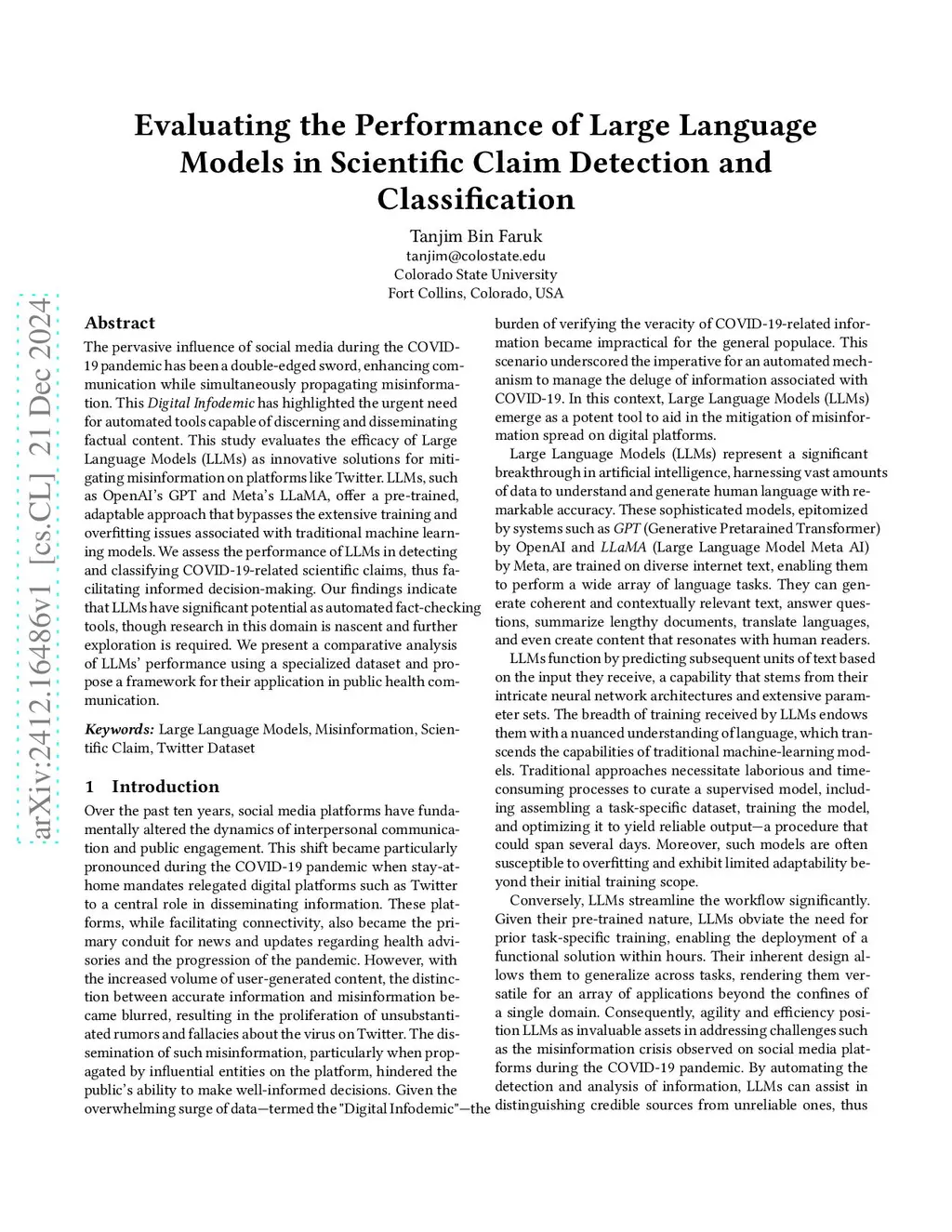 The pervasive influence of social media during the COVID-19 pandemic has been a double-edged sword, enhancing communication while simultaneously propagating misinformation. This \textit{Digital Infodemic} has highlighted the urgent need for automated tools capable of discerning and disseminating factual content. This study evaluates the efficacy of Large Language Models (LLMs) as innovative solutions for mitigating misinformation on platforms like Twitter. LLMs, such as OpenAI's GPT and Meta's LLaMA, offer a pre-trained, adaptable approach that bypasses the extensive training and overfitting issues associated with traditional machine learning models. We assess the performance of LLMs in detecting and classifying COVID-19-related scientific claims, thus facilitating informed decision-making. Our findings indicate that LLMs have significant potential as automated fact-checking tools, though research in this domain is nascent and further exploration is required. We present a comparative analysis of LLMs' performance using a specialized dataset and propose a framework for their application in public health communication.