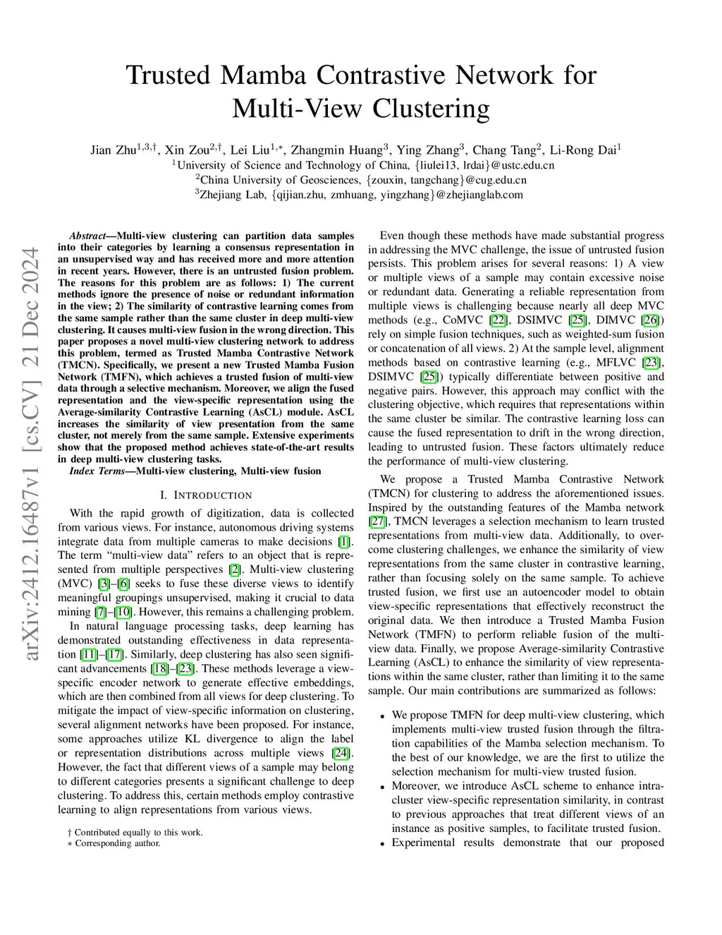 Multi-view clustering can partition data samples into their categories by learning a consensus representation in an unsupervised way and has received more and more attention in recent years. However, there is an untrusted fusion problem. The reasons for this problem are as follows: 1) The current methods ignore the presence of noise or redundant information in the view; 2) The similarity of contrastive learning comes from the same sample rather than the same cluster in deep multi-view clustering. It causes multi-view fusion in the wrong direction. This paper proposes a novel multi-view clustering network to address this problem, termed as Trusted Mamba Contrastive Network (TMCN). Specifically, we present a new Trusted Mamba Fusion Network (TMFN), which achieves a trusted fusion of multi-view data through a selective mechanism. Moreover, we align the fused representation and the view-specific representation using the Average-similarity Contrastive Learning (AsCL) module. AsCL increases the similarity of view presentation from the same cluster, not merely from the same sample. Extensive experiments show that the proposed method achieves state-of-the-art results in deep multi-view clustering tasks. The source code is available atthis https URL.