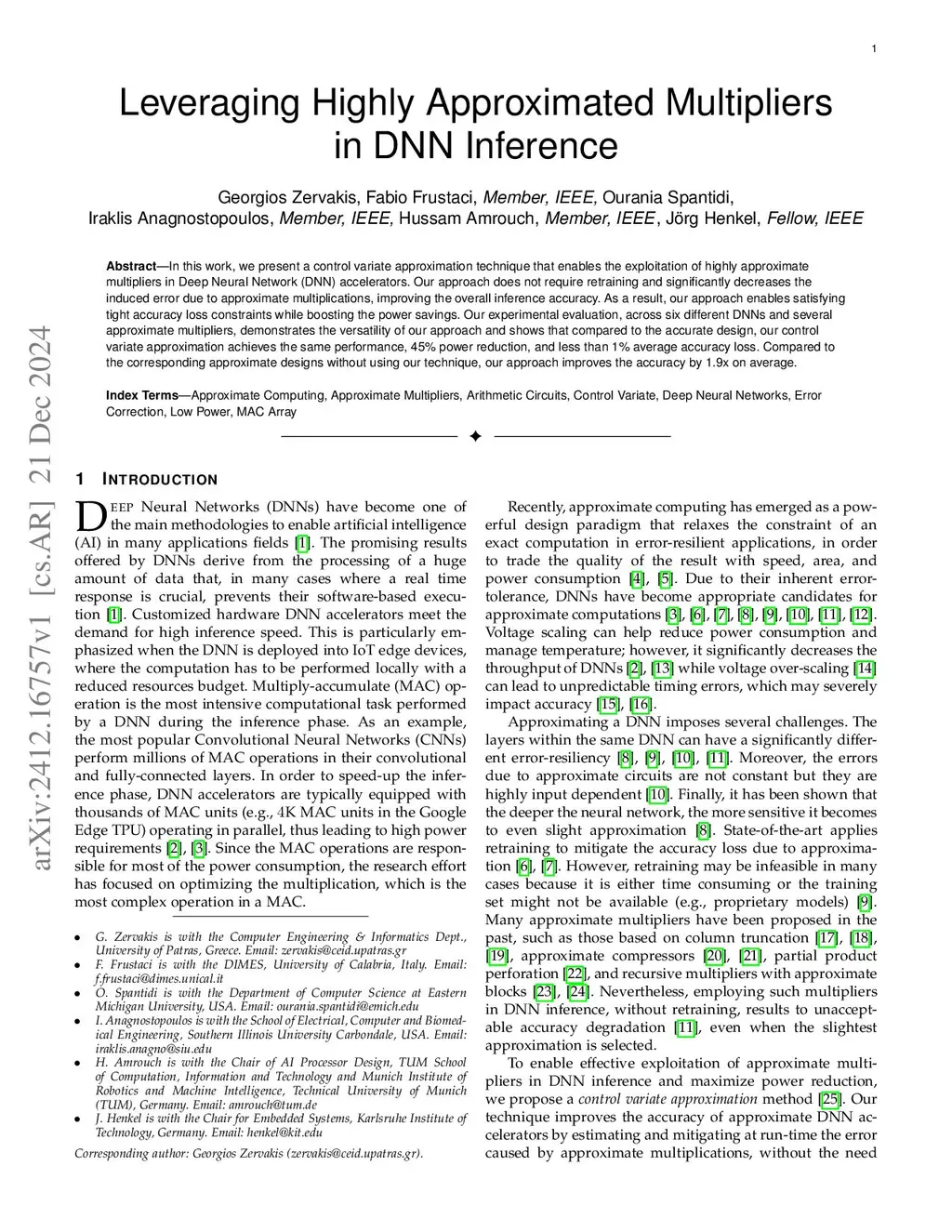 In this work, we present a control variate approximation technique that enables the exploitation of highly approximate multipliers in Deep Neural Network (DNN) accelerators. Our approach does not require retraining and significantly decreases the induced error due to approximate multiplications, improving the overall inference accuracy. As a result, our approach enables satisfying tight accuracy loss constraints while boosting the power savings. Our experimental evaluation, across six different DNNs and several approximate multipliers, demonstrates the versatility of our approach and shows that compared to the accurate design, our control variate approximation achieves the same performance, 45% power reduction, and less than 1% average accuracy loss. Compared to the corresponding approximate designs without using our technique, our approach improves the accuracy by 1.9x on average.
