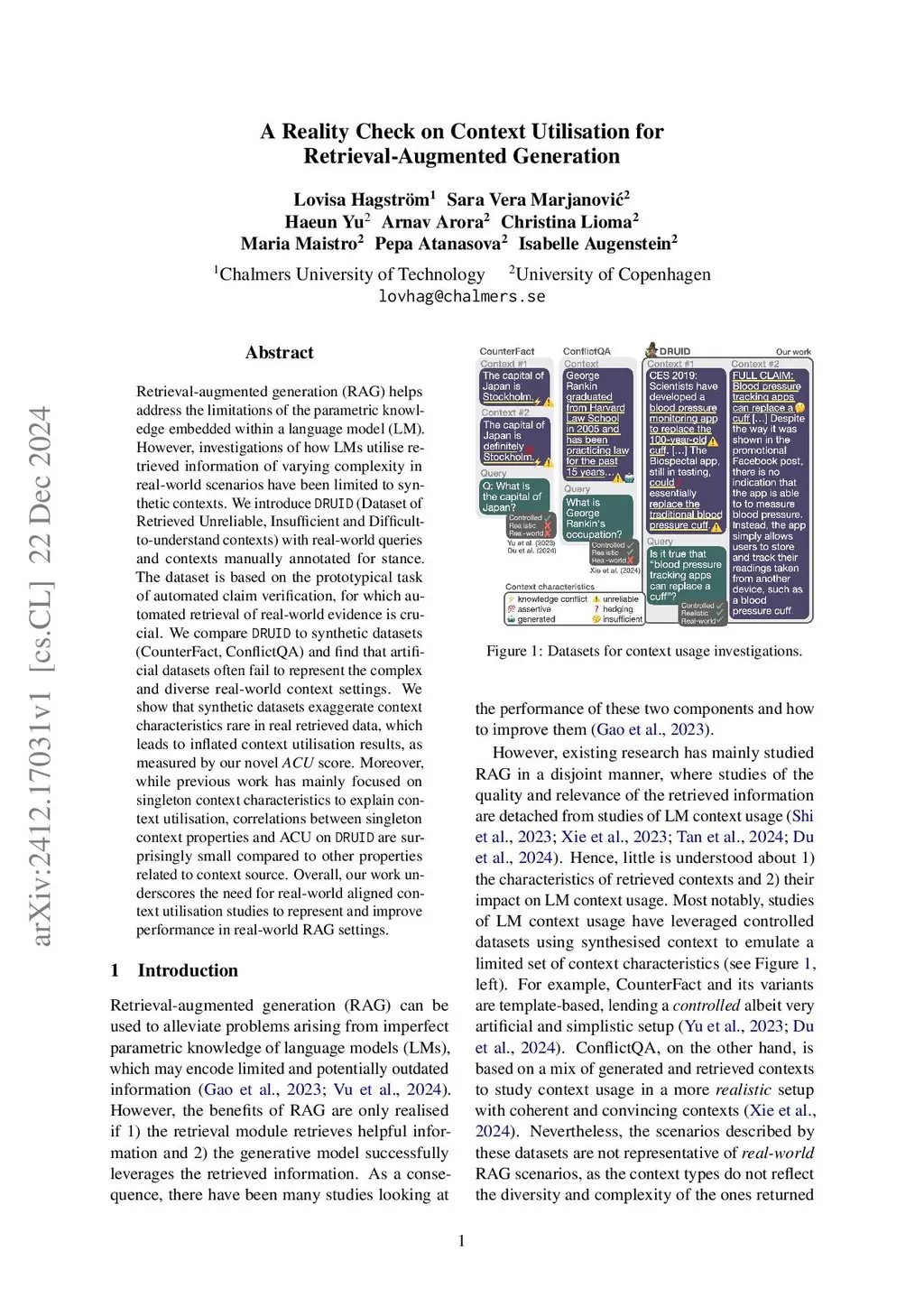 Retrieval-augmented generation (RAG) helps address the limitations of parametric knowledge embedded within a language model (LM). In real world settings, retrieved information can vary in complexity, yet most investigations of LM utilisation of context has been limited to synthetic text. We introduce DRUID (Dataset of Retrieved Unreliable, Insufficient and Difficult-to-understand contexts) with real-world queries and contexts manually annotated for stance. The dataset is based on the prototypical task of automated claim verification, for which automated retrieval of real-world evidence is crucial. We compare DRUID to synthetic datasets (CounterFact, ConflictQA) and find that artificial datasets often fail to represent the complexity and diversity of realistically retrieved context. We show that synthetic datasets exaggerate context characteristics rare in real retrieved data, which leads to inflated context utilisation results, as measured by our novel ACU score. Moreover, while previous work has mainly focused on singleton context characteristics to explain context utilisation, correlations between singleton context properties and ACU on DRUID are surprisingly small compared to other properties related to context source. Overall, our work underscores the need for real-world aligned context utilisation studies to represent and improve performance in real-world RAG settings.