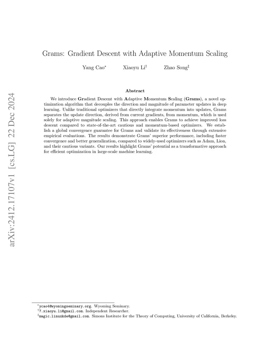 We introduce radient Descent with daptive omentum caling (), a novel optimization algorithm that decouples the direction and magnitude of parameter updates in deep learning. Unlike traditional optimizers that directly integrate momentum into updates, Grams separates the update direction, derived from current gradients, from momentum, which is used solely for adaptive magnitude scaling. This approach enables Grams to achieve improved loss descent compared to state-of-the-art cautious and momentum-based optimizers. We theoretically demonstrate that Grams descents faster than other state-of-the-art optimizers and establish a global convergence guarantee for Grams. We also validate its effectiveness through extensive empirical evaluations. The results demonstrate Grams' superior performance, including faster convergence and better generalization, compared to widely-used optimizers such as Adam, Lion, and their cautious variants. Our results highlight Grams' potential as a transformative approach for efficiently training and fine-tuning large language models. Code is available atthis https URL.