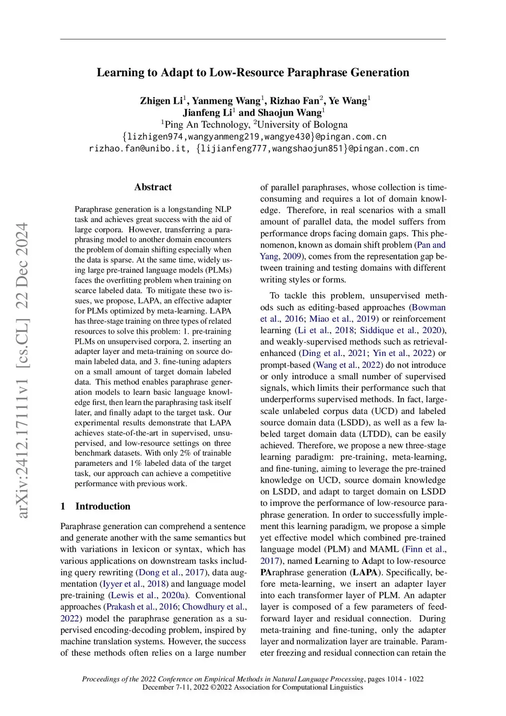 Paraphrase generation is a longstanding NLP task and achieves great success with the aid of large corpora. However, transferring a paraphrasing model to another domain encounters the problem of domain shifting especially when the data is sparse. At the same time, widely using large pre-trained language models (PLMs) faces the overfitting problem when training on scarce labeled data. To mitigate these two issues, we propose, LAPA, an effective adapter for PLMs optimized by meta-learning. LAPA has three-stage training on three types of related resources to solve this problem: 1. pre-training PLMs on unsupervised corpora, 2. inserting an adapter layer and meta-training on source domain labeled data, and 3. fine-tuning adapters on a small amount of target domain labeled data. This method enables paraphrase generation models to learn basic language knowledge first, then learn the paraphrasing task itself later, and finally adapt to the target task. Our experimental results demonstrate that LAPA achieves state-of-the-art in supervised, unsupervised, and low-resource settings on three benchmark datasets. With only 2\% of trainable parameters and 1\% labeled data of the target task, our approach can achieve a competitive performance with previous work.