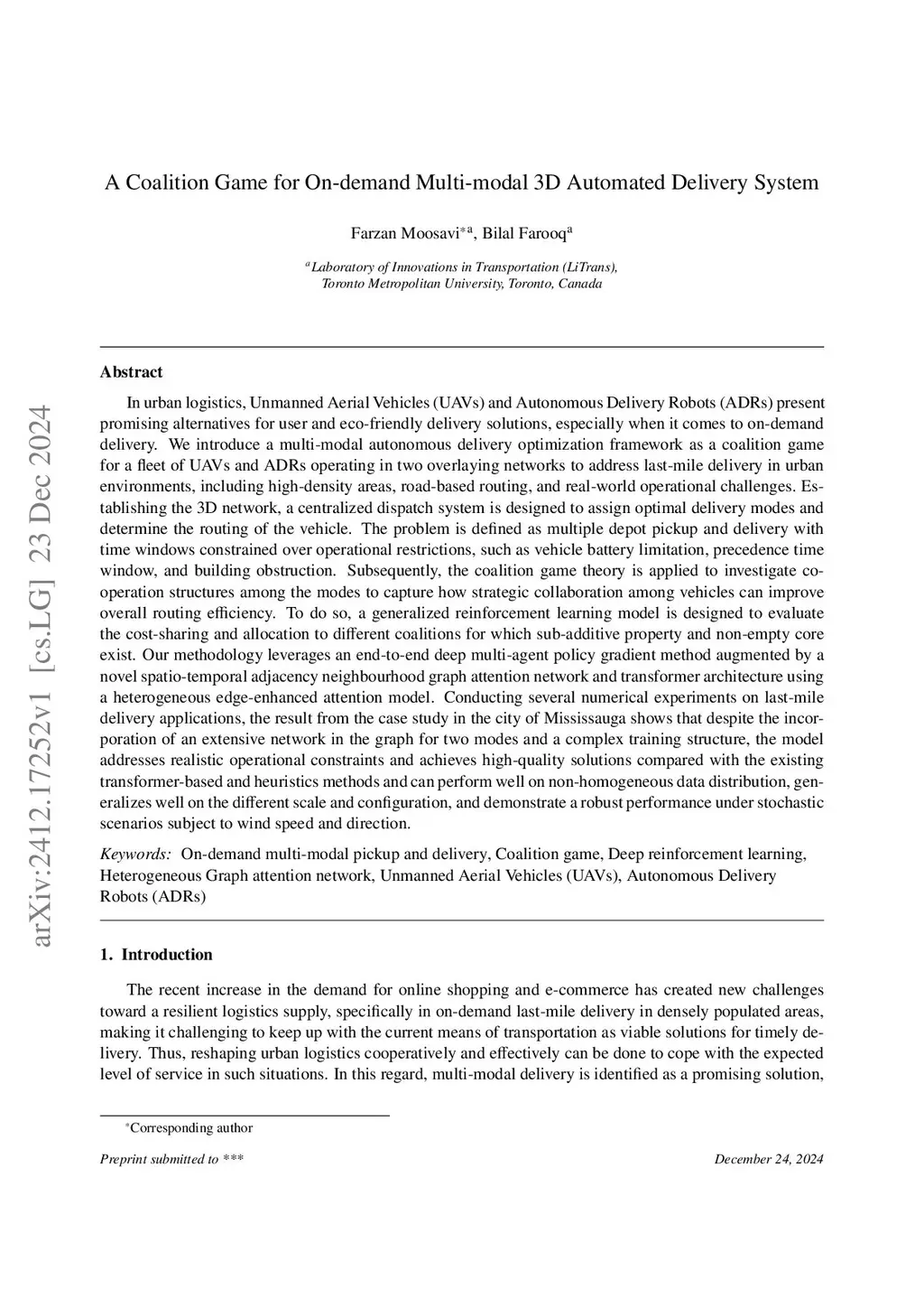 We introduce a multi-modal autonomous delivery optimization framework as a coalition game for a fleet of UAVs and ADRs operating in two overlaying networks to address last-mile delivery in urban environments, including high-density areas and time-critical applications. The problem is defined as multiple depot pickup and delivery with time windows constrained over operational restrictions, such as vehicle battery limitation, precedence time window, and building obstruction. Utilizing the coalition game theory, we investigate cooperation structures among the modes to capture how strategic collaboration can improve overall routing efficiency. To do so, a generalized reinforcement learning model is designed to evaluate the cost-sharing and allocation to different modes to learn the cooperative behaviour with respect to various realistic scenarios. Our methodology leverages an end-to-end deep multi-agent policy gradient method augmented by a novel spatio-temporal adjacency neighbourhood graph attention network using a heterogeneous edge-enhanced attention model and transformer architecture. Several numerical experiments on last-mile delivery applications have been conducted, showing the results from the case study in the city of Mississauga, which shows that despite the incorporation of an extensive network in the graph for two modes and a complex training structure, the model addresses realistic operational constraints and achieves high-quality solutions compared with the existing transformer-based and classical methods. It can perform well on non-homogeneous data distribution, generalizes well on different scales and configurations, and demonstrates a robust cooperative performance under stochastic scenarios across various tasks, which is effectively reflected by coalition analysis and cost allocation to signify the advantage of cooperation.